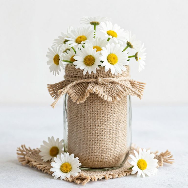 Photograph of a clear glass jar filled with white daisies with yellow centers, topped with a rustic burlap ribbon tied in a bow. The jar is placed on a matching burlap coaster, which rests on a white surface. A few daisies are scattered around the base of the jar, enhancing the natural, simple aesthetic. The background is pure white, making the vibrant flowers and textured burlap stand out prominently. The overall style is fresh and minimalist, evoking a country, handmade feel.