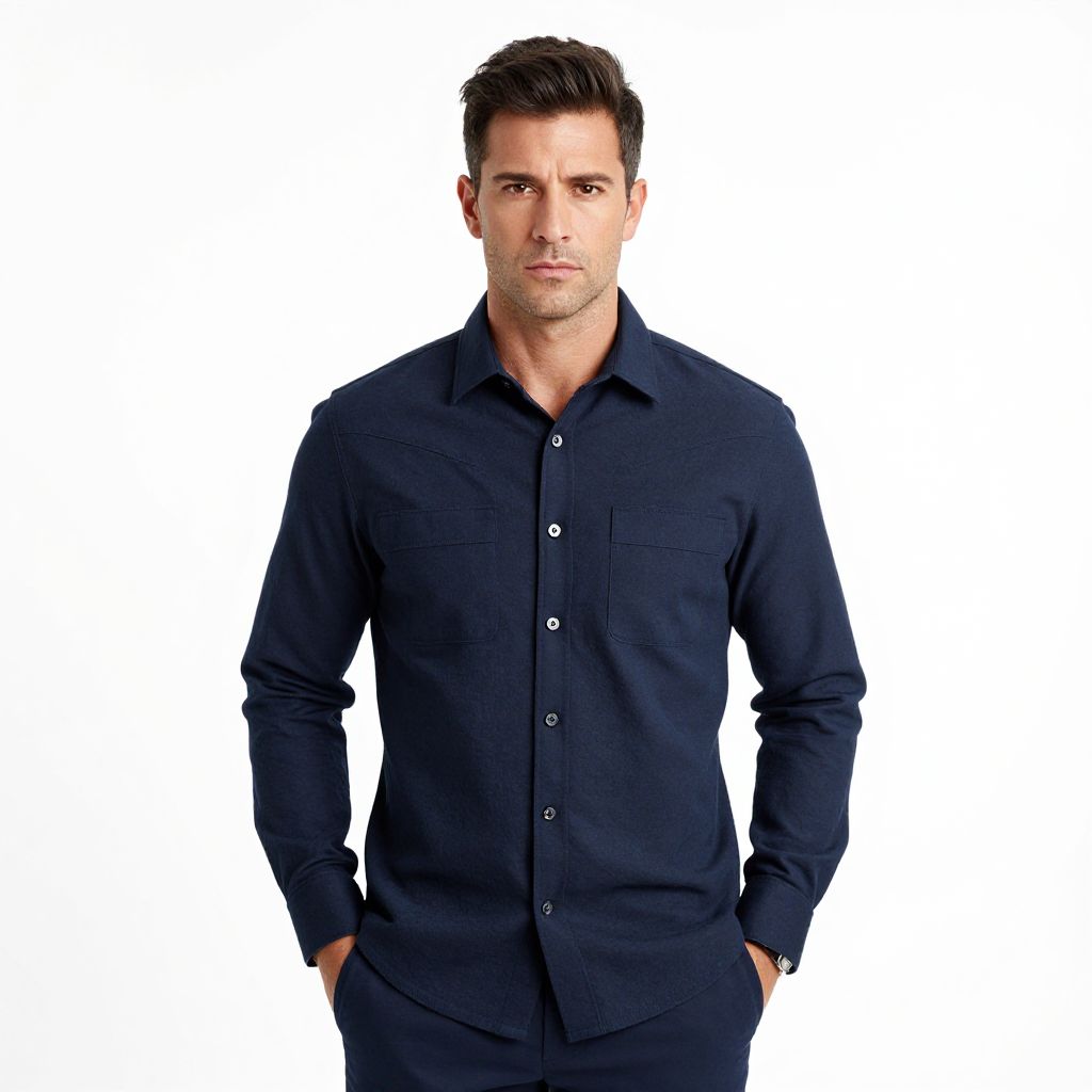Photograph of a Caucasian man with short, dark brown hair and light stubble, standing against a white background. He has a muscular build and is wearing a dark blue, long-sleeved button-up shirt with pockets on the chest and hands in his pockets. The shirt is slightly fitted, highlighting his physique. His expression is neutral, with a slight, confident gaze directed at the camera. The lighting is even, with no shadows, emphasizing the clean, minimalistic look of the image.