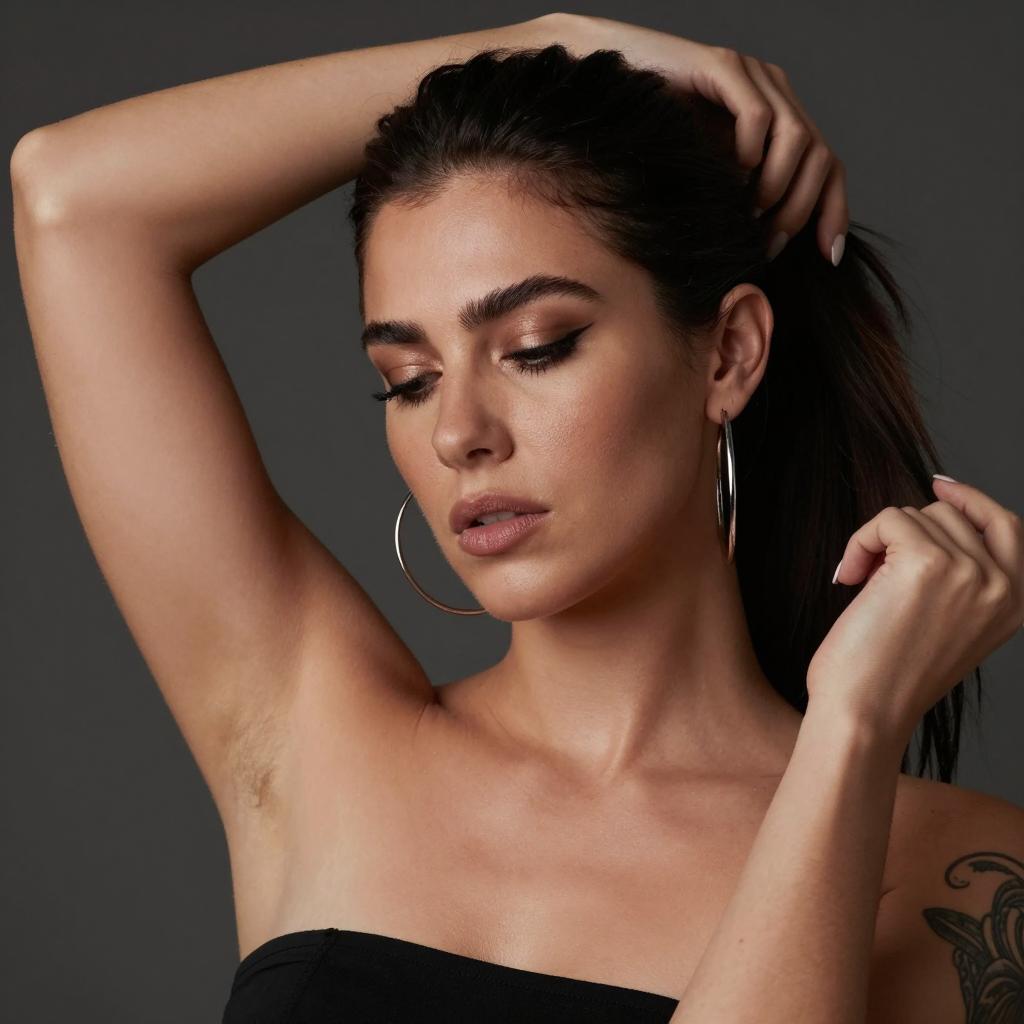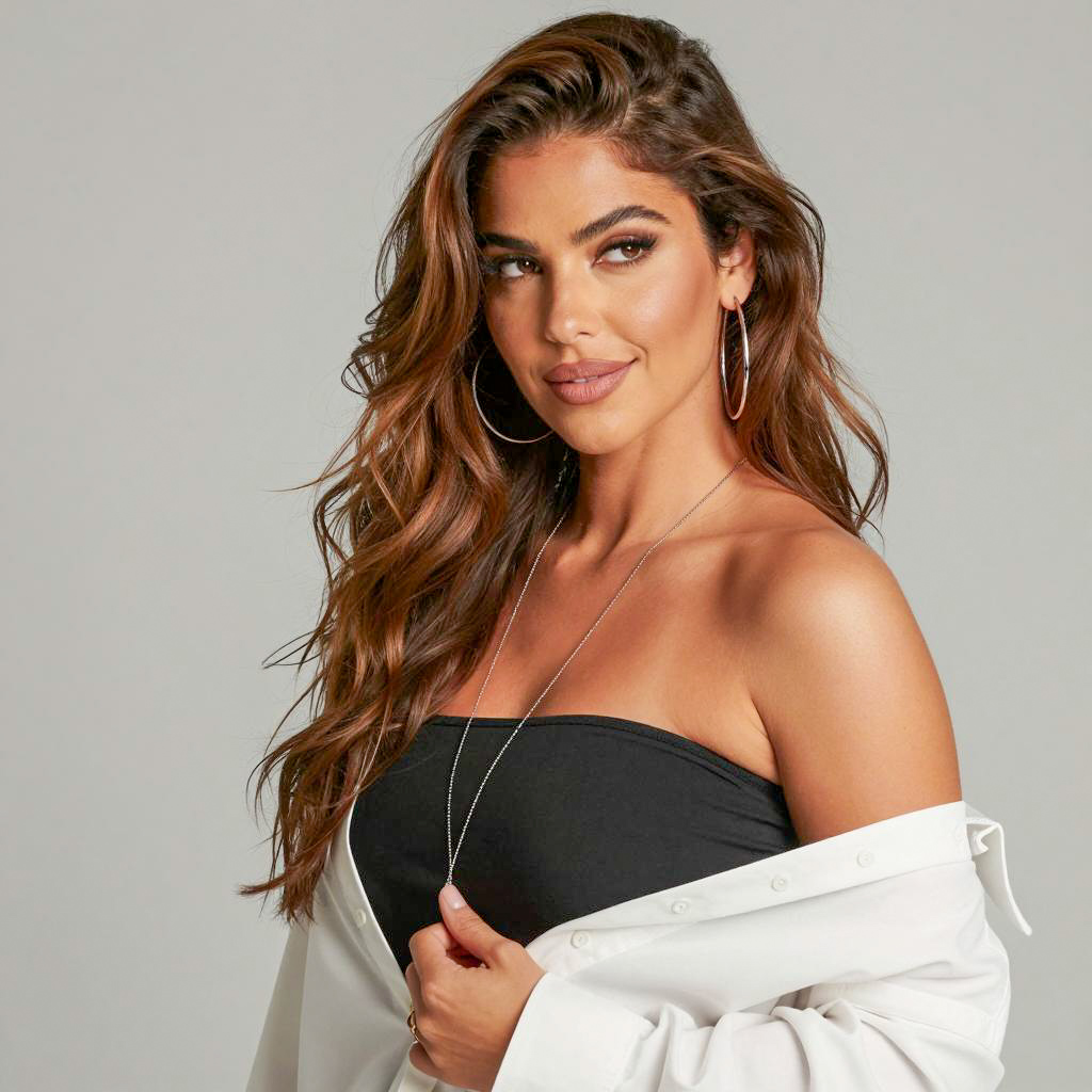 Young woman with light skin, brown hair under green Puma cap, wearing black bra and black leather jacket, large gold hoop earrings, gold necklace with yellow pendant, standing in front of green chain-link fence, looking slightly to the side.