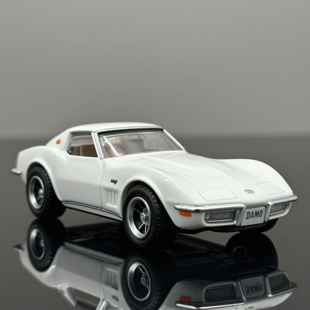 Shiny white Chevrolet Corvette C3 1970 diecast model car displayed in 1/18 scale, featuring a sleek design with black accents, orange side markers, and a \"DAMO\" license plate, positioned on a reflective surface against a neutral gray backdrop.