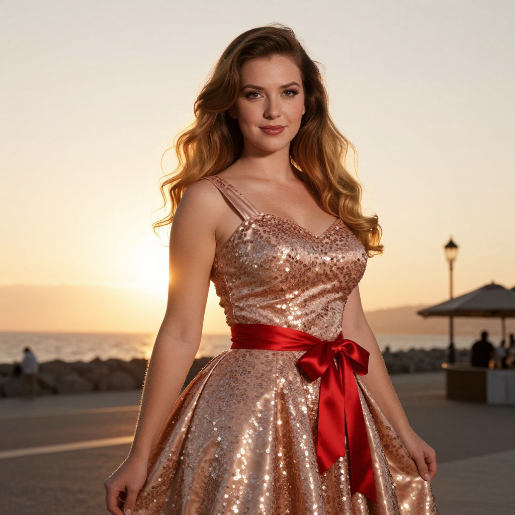 An attractive woman with long, flowing ombre brown blonde hair shimmering in the sunlight, wearing a retro-inspired costume from the 1950s — a sequined satin gown with a full skirt and a red satin sash, standing on a seaside promenade with a golden sunset behind her. She has soft, freckled cheeks, a radiant smile, and a calm, elegant demeanor.. The woman has big tits and cute face