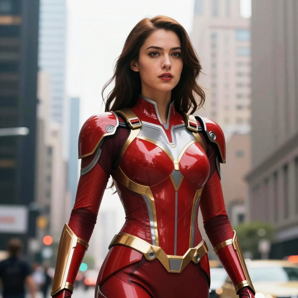 This striking image features a woman clad in a vibrant Crimson Dynamo costume, showcasing a futuristic and heroic aesthetic. The armor's glossy red and gold design exudes power and confidence, perfectly complementing her determined expression against a dynamic urban backdrop.