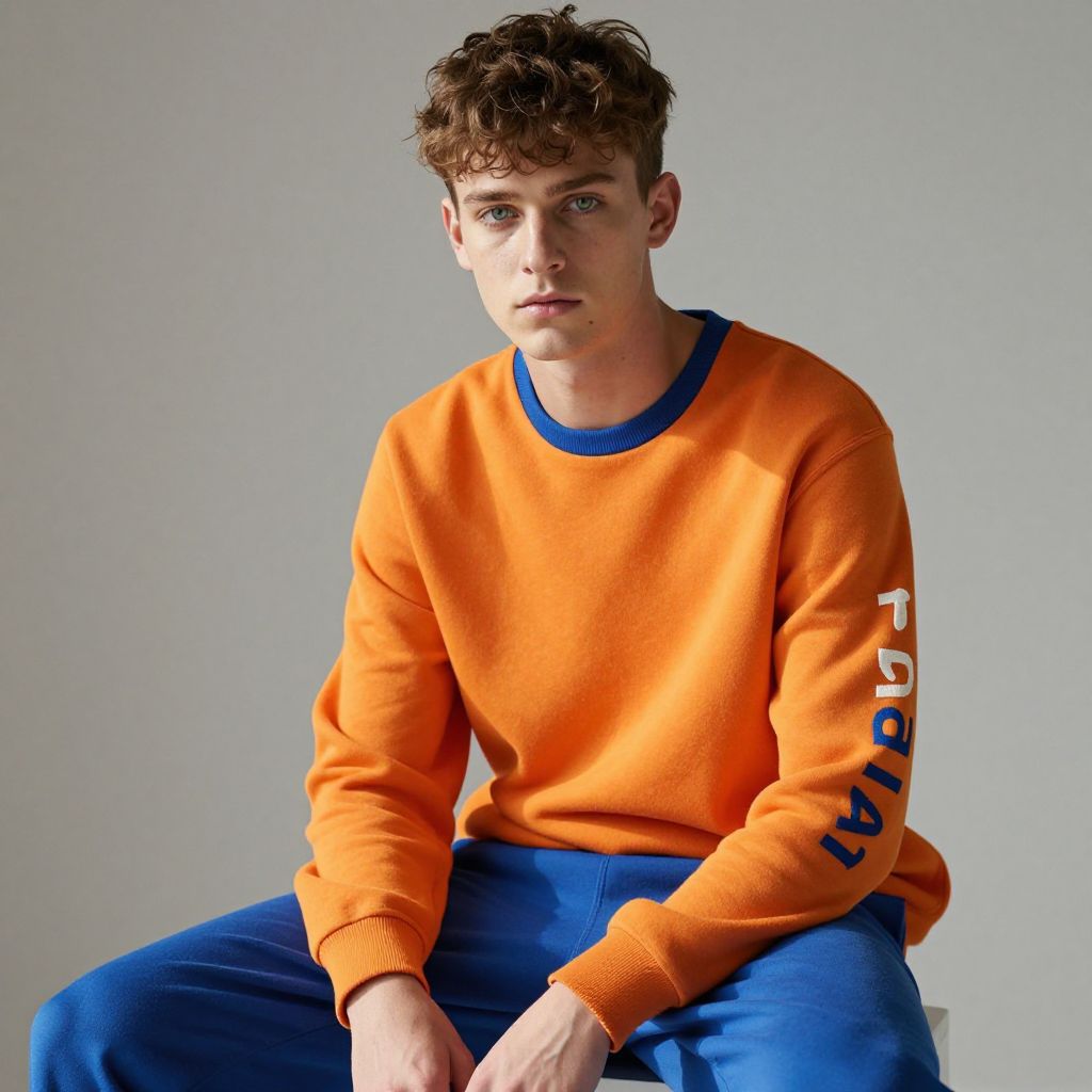 Photograph of a young Caucasian man with short, curly brown hair and fair skin, sitting against a plain gray background. He wears an orange, long-sleeved sweatshirt with blue trim and the word "SPORT" in bold white letters on the right sleeve, paired with blue pants. His expression is neutral, and he gazes directly at the camera. The lighting is even, highlighting the vibrant colors of his clothing. He is seated with his legs slightly apart, and his hands rest on his thighs. The overall style is casual and modern.