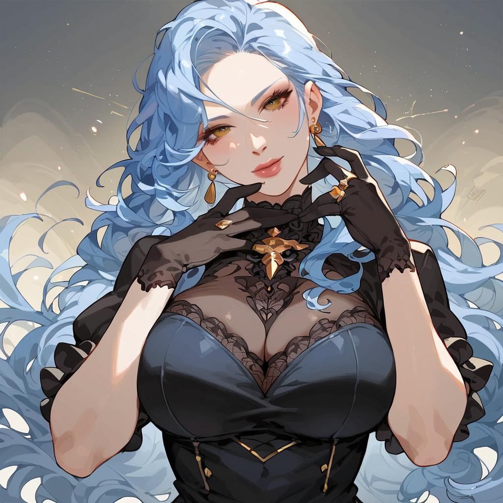 Score_9, score_8_up, score_7_up, score_6_up, high quality, masterpiece, 8k, highres, detailed, feet out of frame, (looking at viewer) :: solo, woman, gothic, (mature:1.35), (adult:1.35), athletic, (small bu BREAK 1.2), standing, long face :: wearing black dress, short sleeves, black tulle gloves, exposed arms, gold earrings :: (cocky), smirk:1.0, closed mouth, head tilt, black lipstick :: detailed face :: (light blue hair), very long hair, hair down, wavy hair, (messy hair:1.15) :: (orange eyes:1.1), gorgeous eyes, ring eyes, detailed eyes, detailed face