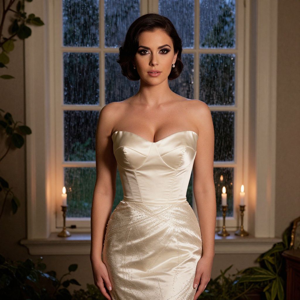 Photograph of a beautiful woman with medium-length dark brown hair, wearing a strapless, form-fitting white satin wedding dress with a sweetheart neckline that accentuates her cleavage. She has a fair skin tone and is standing in a dimly lit room with rain visible on a window behind her. The background includes two lit candles on either side of the window and some potted plants. The lighting highlights the smooth texture of her dress and her elegant appearance. The overall mood is romantic and intimate.