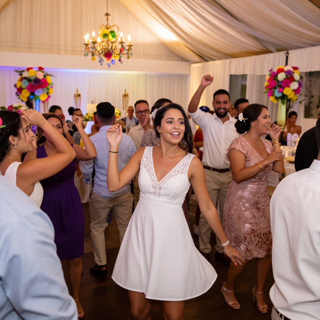 Photograph of a joyful wedding reception with guests dancing, featuring a smiling bride in a white lace dress, colorful floral centerpieces, and elegant chandel