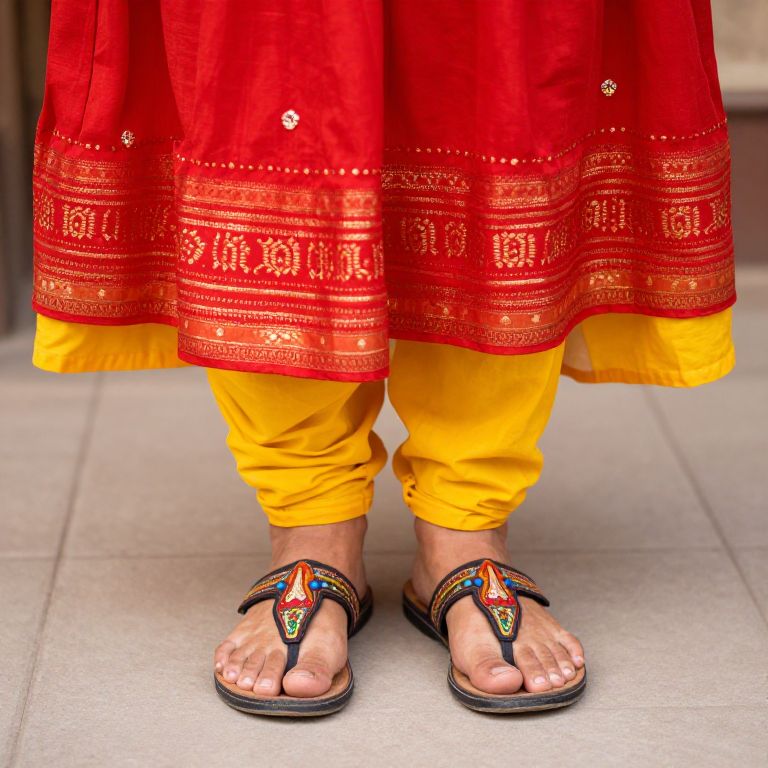 A person is wearing a traditional Indian outfit with a red and yellow color scheme. The person is also wearing a pair of sandals with a colorful design on the bottom.