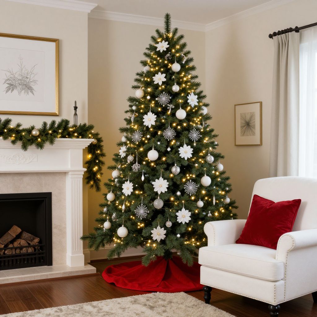 Cozy living room featuring a tall, elegantly decorated Christmas tree adorned with white floral ornaments, golden lights, and a red fabric skirt, positioned between a white armchair with a red pillow and a fireplace mantel decorated with green garlands and framed artwork above.