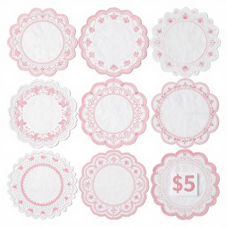 Promotional display featuring ten shabby chic baby shower doilies in soft pink and white hues, intricately designed with scalloped edges and floral patterns, priced at $5 for a set of ten, ideal for DIY vintage baby shower decor.
