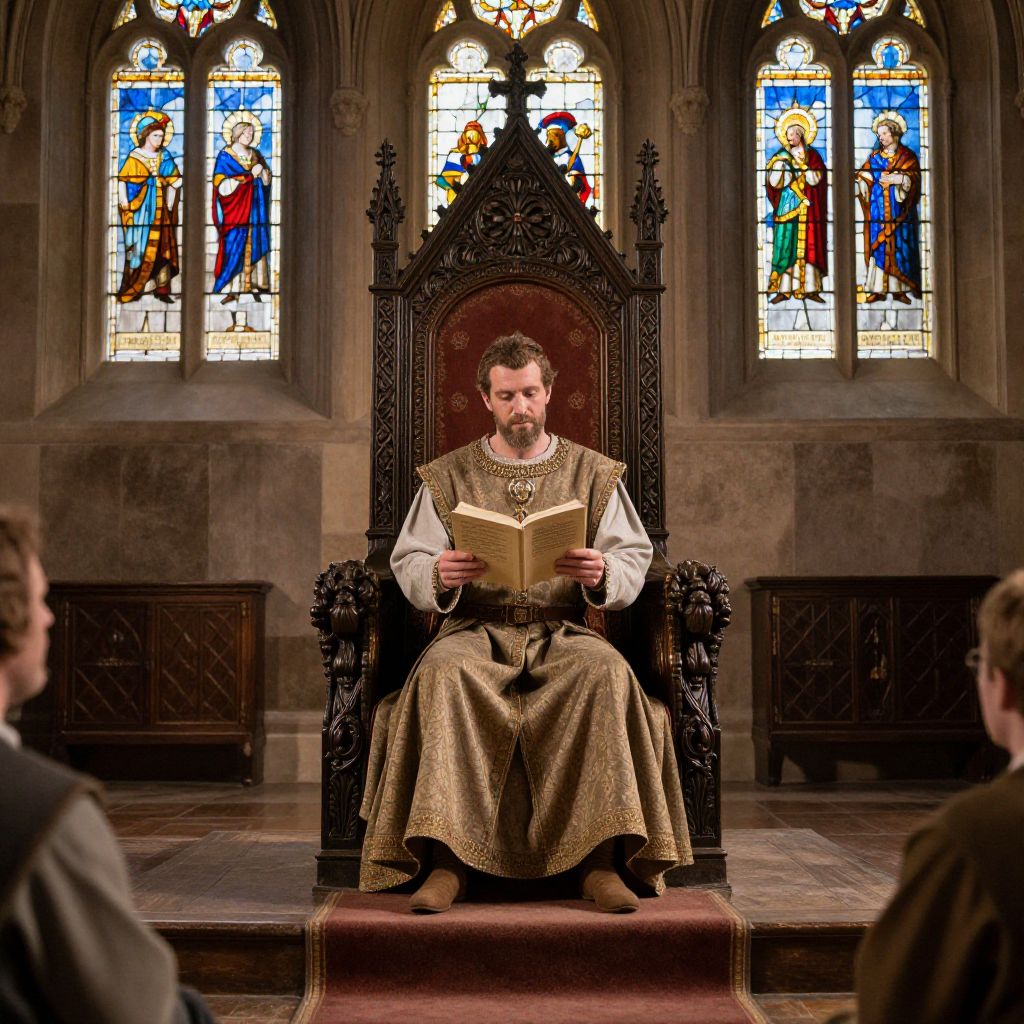 Photograph of a bearded priest in medieval robes reading a book on an ornate throne in a stained glass-lit church.
