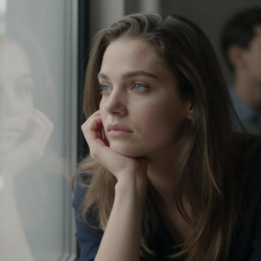 Photograph of a Caucasian woman with short, straight blonde hair, gazing out a window. She wears a white collared shirt. Her expression is pensive. The window has a grid pattern and is slightly open. The background is a dark wall. Natural light illuminates her face.