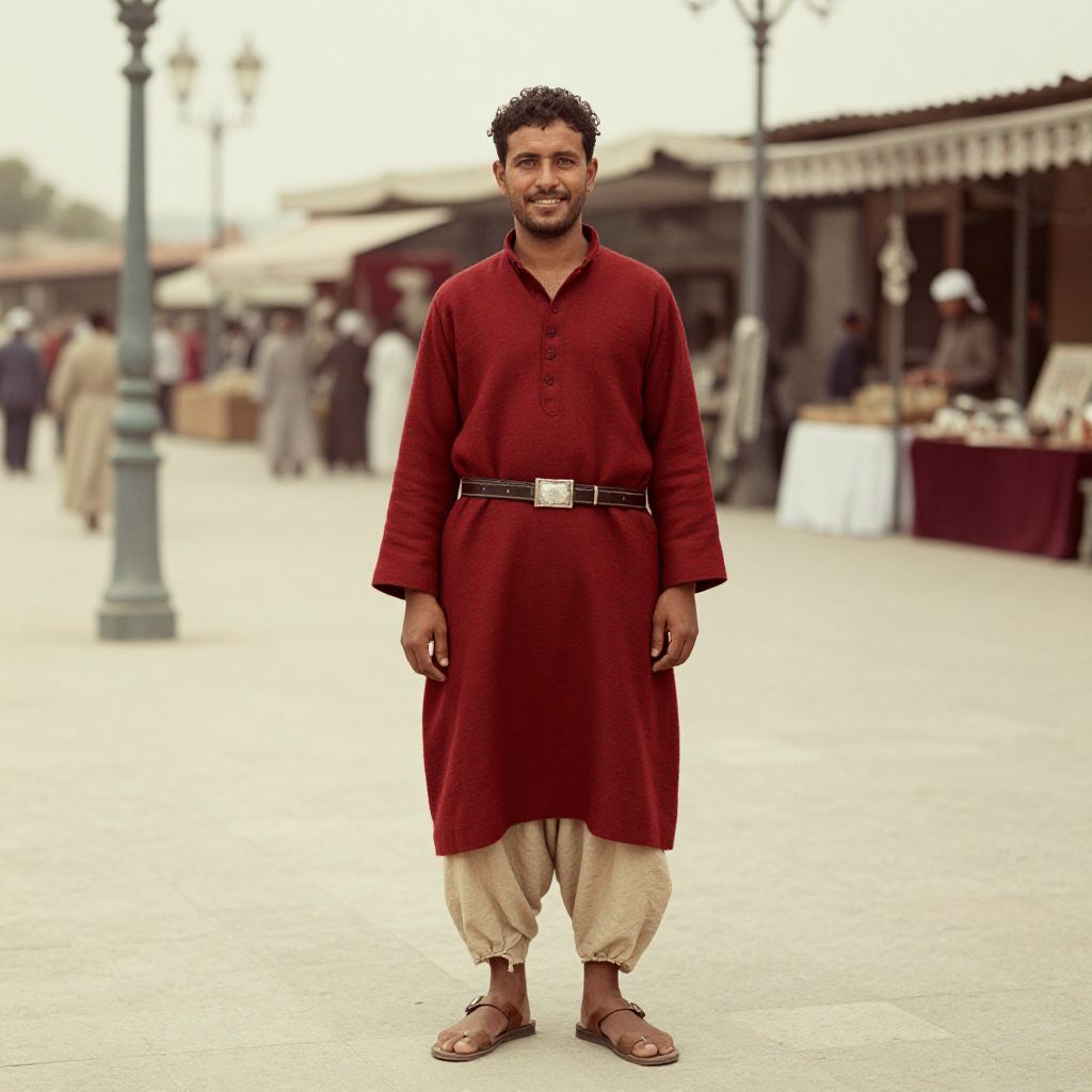 A man, traditional wool chuba in deep red, loose beige cotton pants, leather sandals, simple silver belt, charming market square, colonial-style lamp posts, bustling artisan stalls, hand-tinted photograph, warm smile, inviting expression. Man has masculine face and piercing eyes