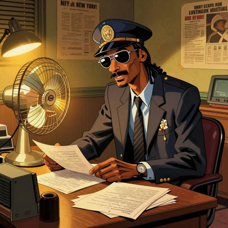 In this highly detailed, manga-style illustration, Snoop Dogg is depicted as a detective in a 1950s summer evening in New York. He sits at a desk, engrossed in paperwork, with a fan blazing air beside him. The room is bathed in warm, golden light, creating a cozy atmosphere. Snoop is dressed in a sharp, vintage suit with a tie and a cap, exuding a sense of professionalism and mystery. The desk is cluttered with stacks of papers, books, and a computer, indicating a busy and focused work environment. The walls are adorned with posters and documents, adding to the sense of a well-used workspace. The overall composition is dynamic, with Snoop's body slightly turned towards the viewer, inviting engagement with the scene. The interplay of colors, textures, and shapes creates a rich, immersive visual experience, capturing the essence of a detective's life in the 1950s.