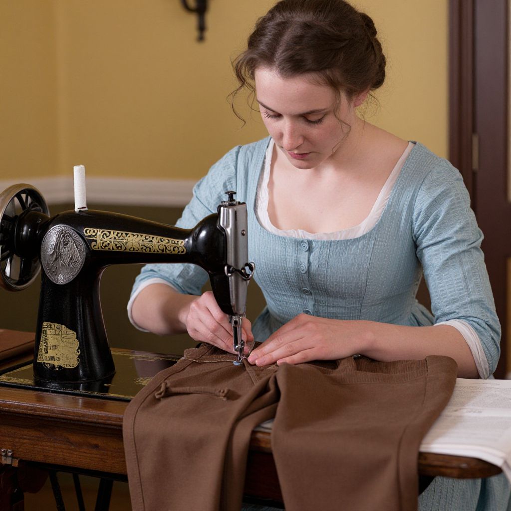Photograph of a young woman with fair skin and brown hair in a blue Victorian dress, sewing brown pants on an ornate black sewing machine in a