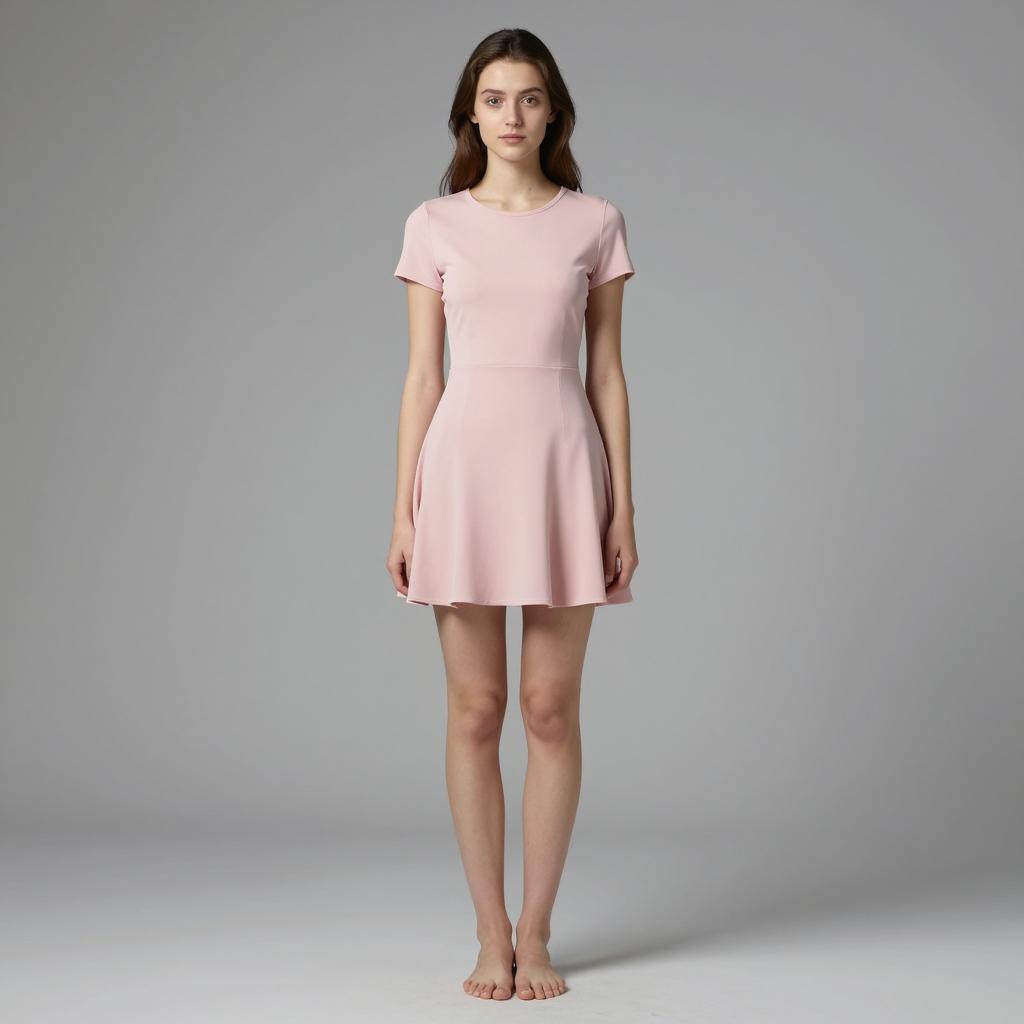 Full body portrait of a young woman with long brown hair, standing barefoot against a plain gray background. She is wearing a simple, short-sleeved pink mini dress with a flared skirt. The image has a realistic style and neutral lighting.