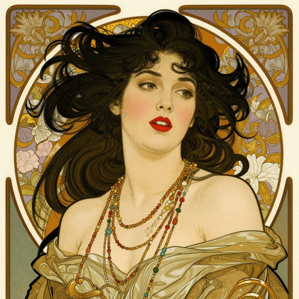 A stylized digital illustration inspired by Art Nouveau aesthetics, featuring a woman with flowing black hair adorned in vibrant red lipstick and a beaded necklace, set against a richly decorated frame with floral motifs and golden accents, evoking themes of love, desire, and timeless elegance reminiscent of George Barbier's work.