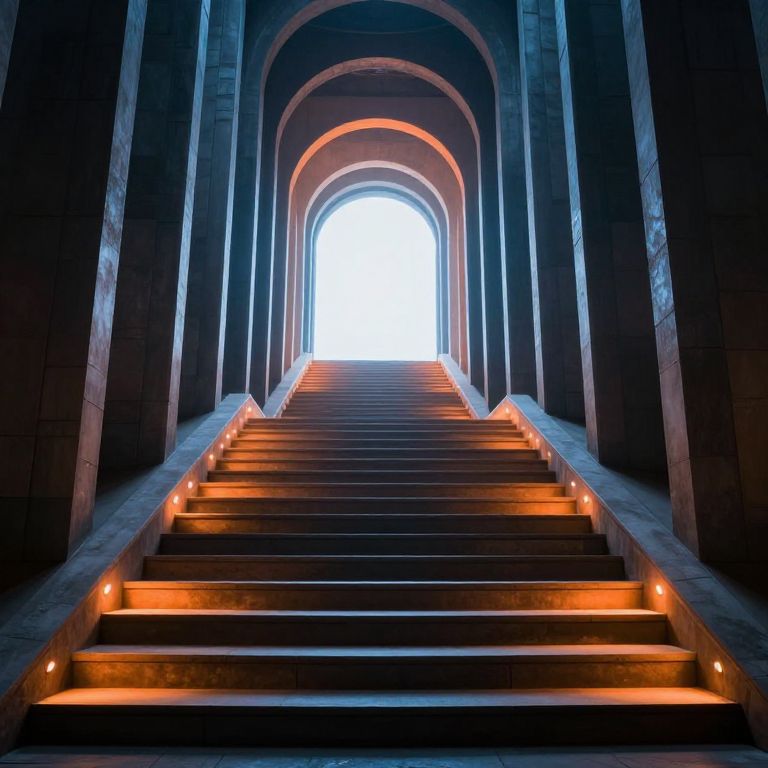 Photograph of a dimly lit, arched staircase with illuminated steps leading to a bright, white-lit exit. Warm orange lights accentuate the