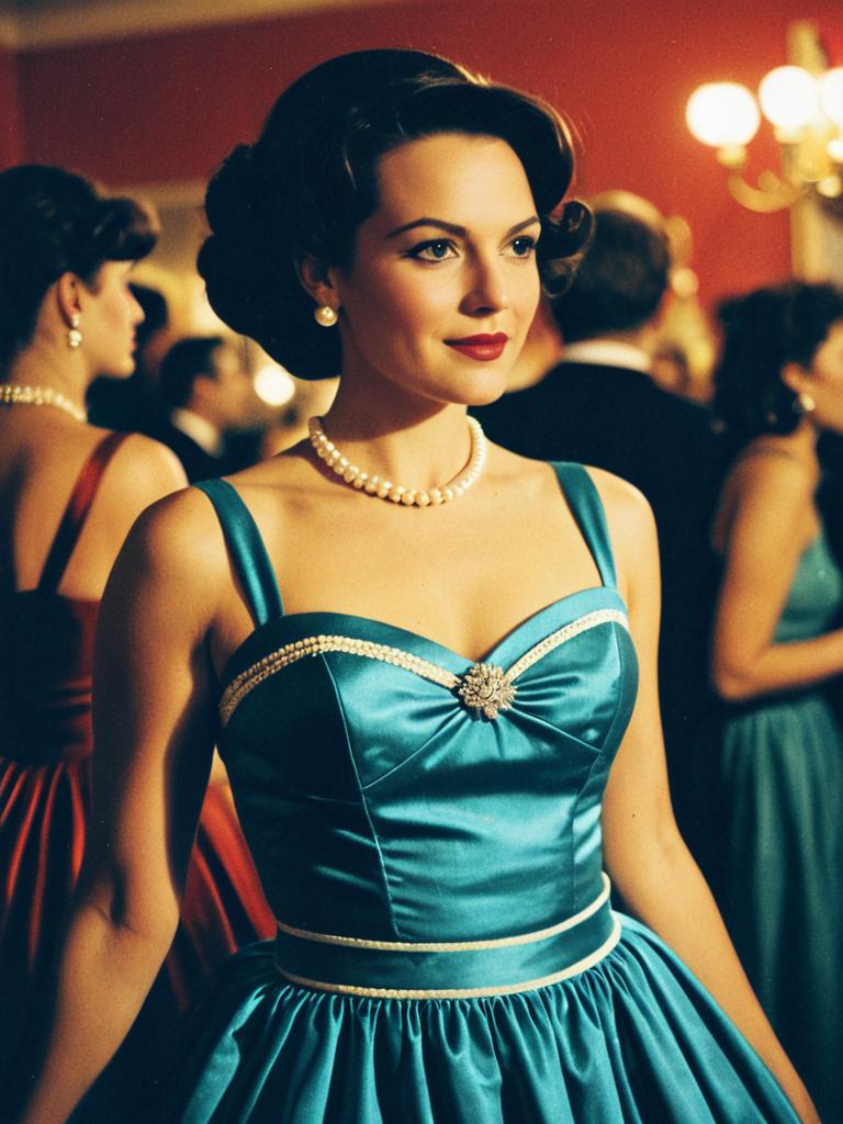 Woman in Retro Party Dress, waist-up editorial portrait, photorealistic tones