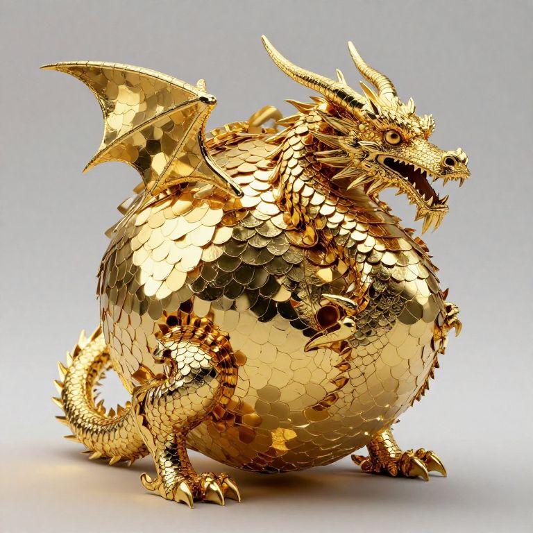 "Dodecahedron dragon made out of thousands of small gold metallic sheets reflecting light, intricate details, hyperrealistic,"