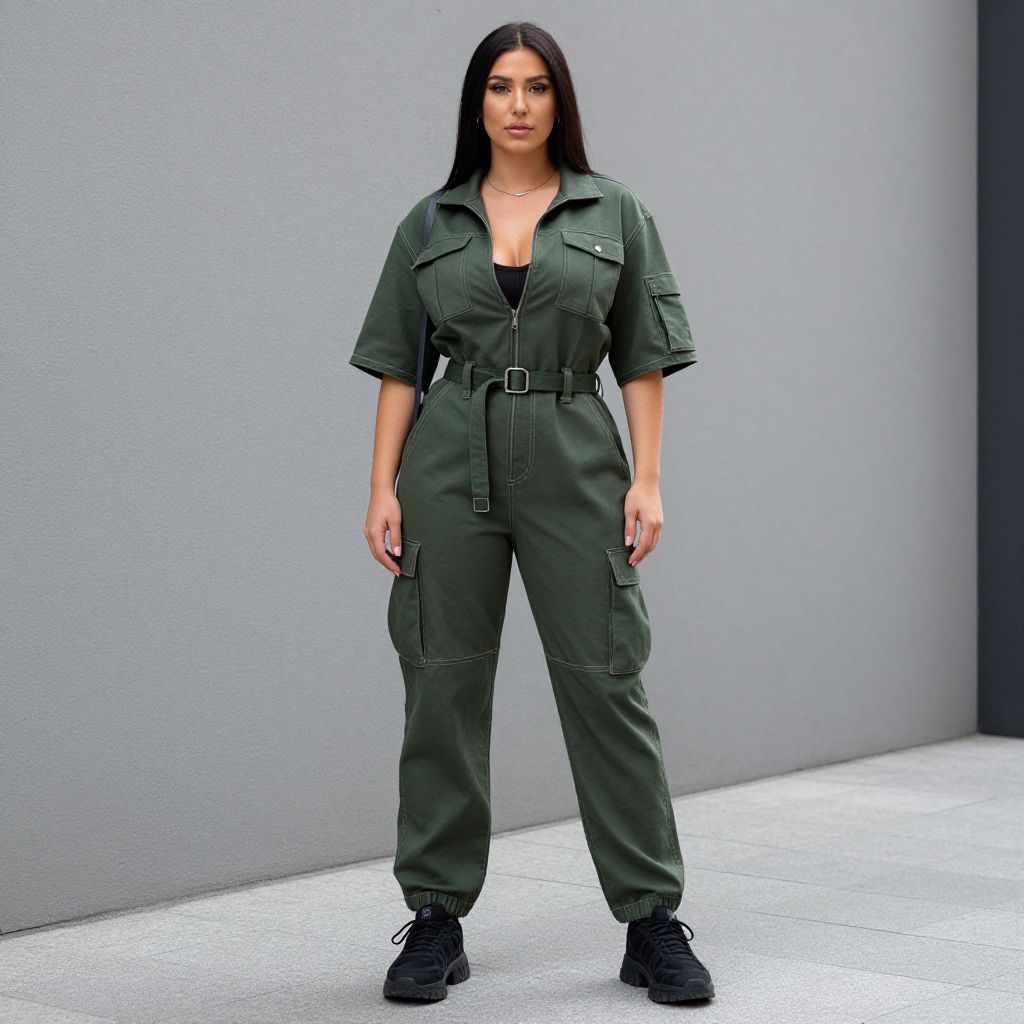 Full body shot, woman, streetwear utility jumpsuit, oversized fit, durable canvas material, deep olive green color, multiple cargo pockets, adjustable waist belt, zippered front, short sleeves, reinforced stitching, breathable mesh lining, chunky black sneakers, minimalist accessories, sleek crossbody bag, urban backdrop, confident pose Sexy. Pretty face and beаutiful eyes. Big breasts