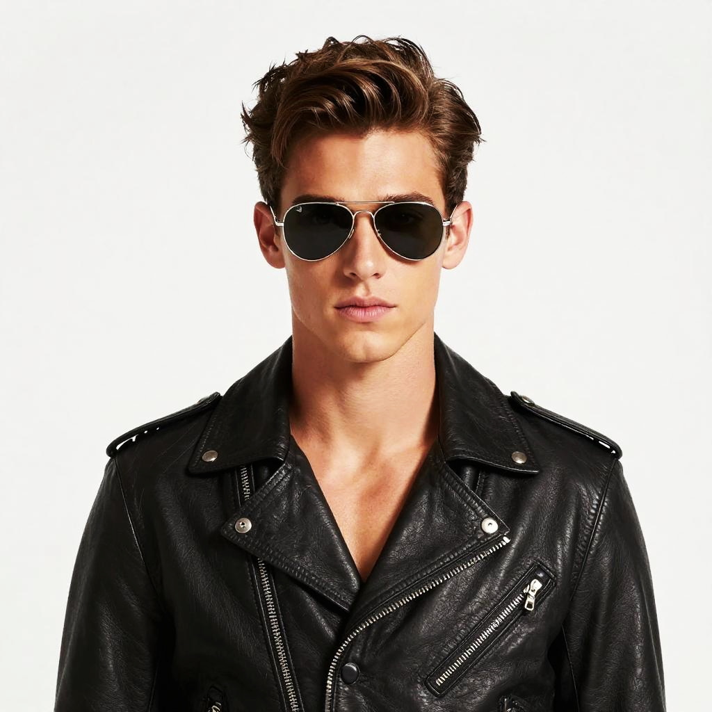 A professional photographic portrait of an attractive young transgender male, wearing sleek aviator sunglasses and a leather biker jacket, with perfect eyes and slim body, white background, photographed by Tim Walker, 4K
