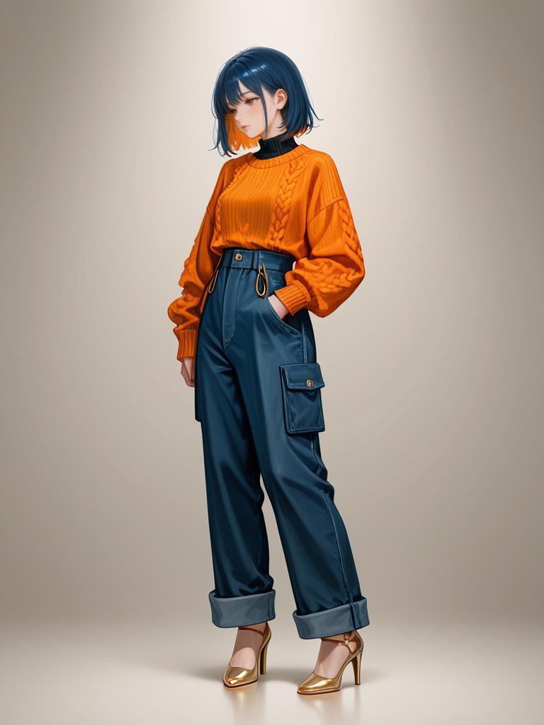 Full body portrait of a woman with dark blue bob haircut wearing a bright orange cropped cable knit sweater with long sleeves and ribbed cuffs, paired with high-waisted dark blue denim cargo pants featuring multiple pockets and tapered legs. She is standing on a neutral studio background, wearing gold strappy high heels.