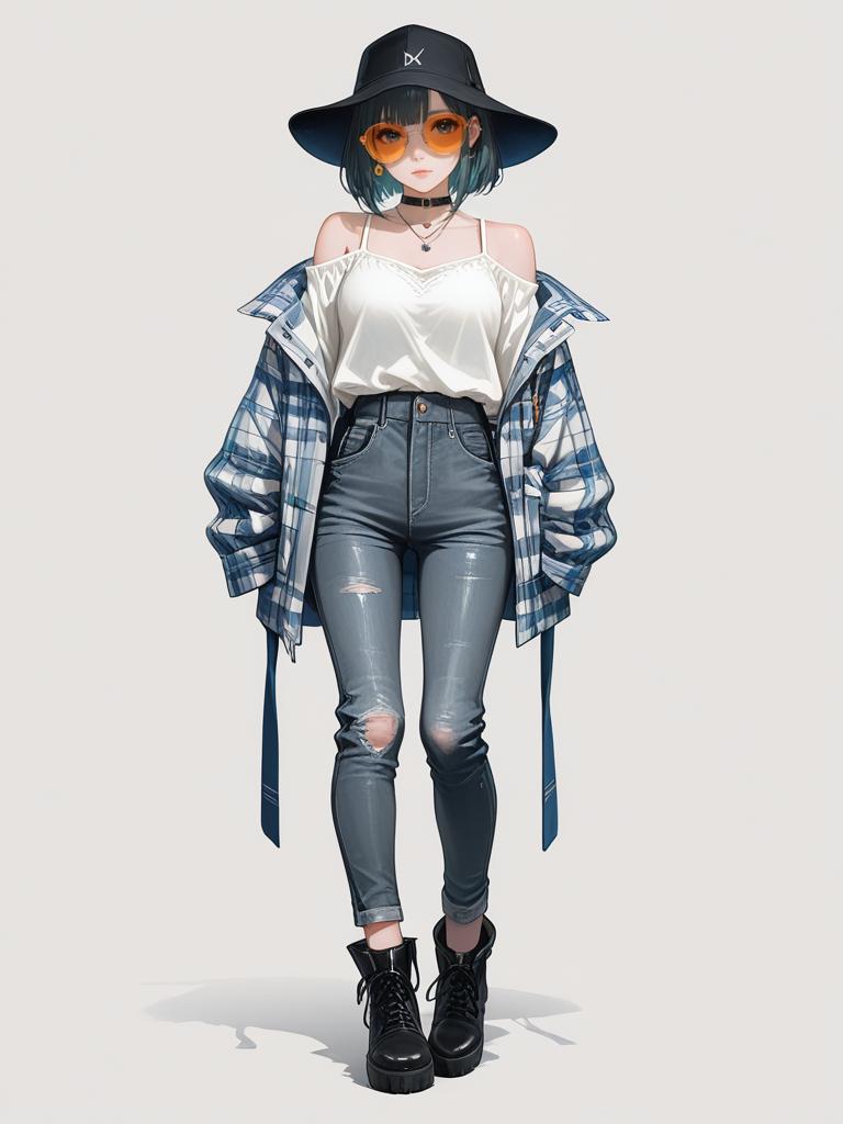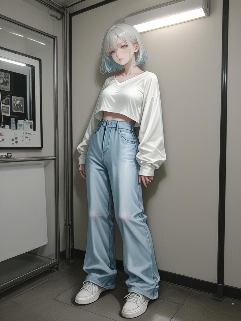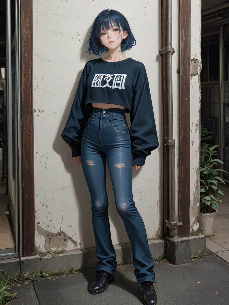 1girl, realistic face, full body shot, Woman, casual streetwear, bright orange cropped cable knit sweater, crew neck, long sleeves with ribbed cuffs, high-waisted dark blue denim cargo pants, multiple pockets, tapered leg, gold strappy high heels, studio background