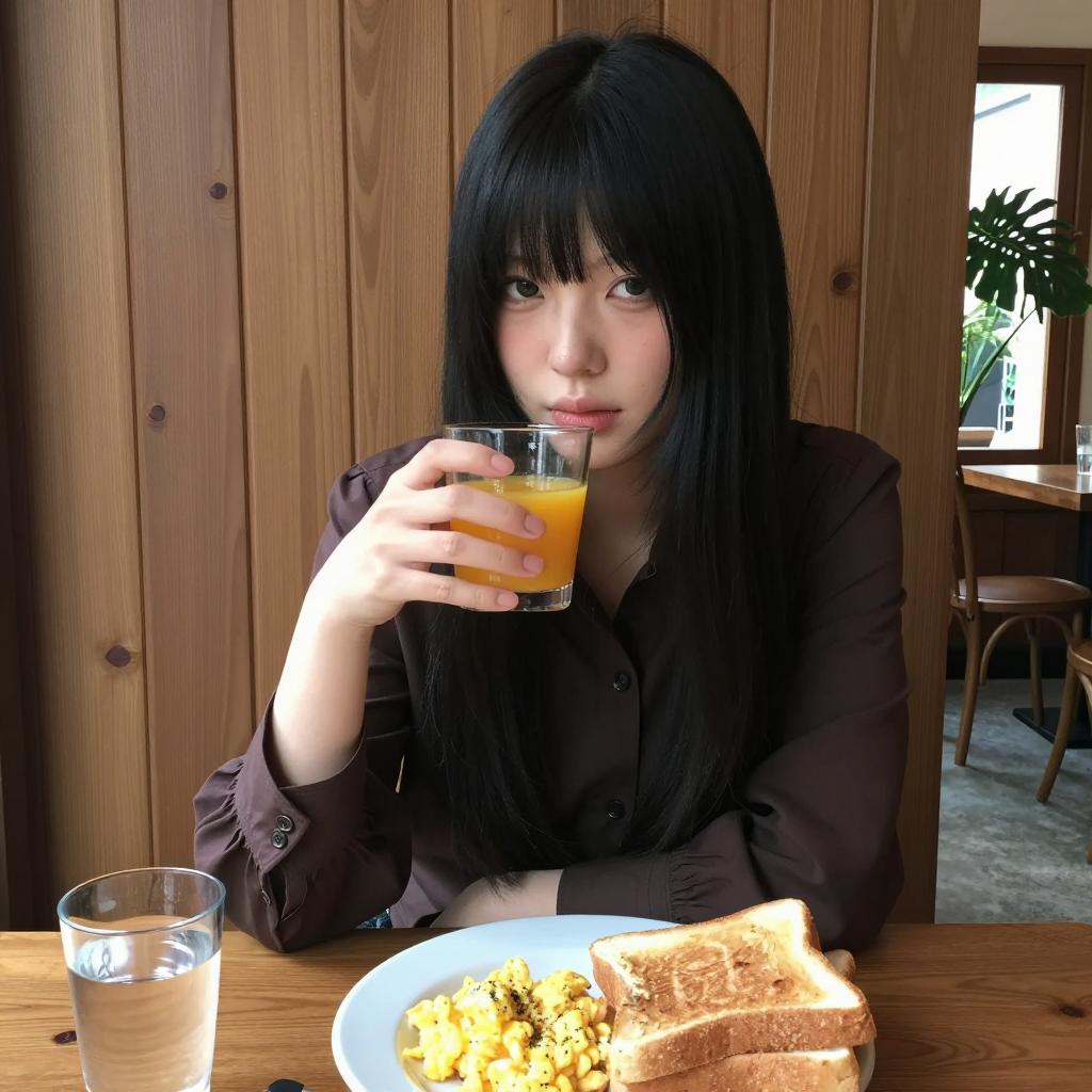 Asian woman with long black hair, bangs, and pale skin, wearing a dark brown blouse, holding a glass of orange juice. Seated at a wooden table, facing the camera. Plate with scrambled eggs and toast on the table. Glass of water to the left. Wooden paneled wall in the background. Potted plant visible through the window to the right.