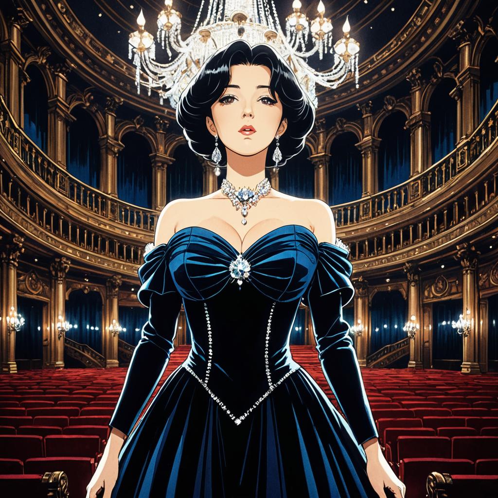 An elegant opera singer, wearing a luxurious velvet gown, standing in a grand opera house with a crystal chandelier, expressing intense emotion, illustrated in the dramatic and elegant anime style of Suzue Miuchi.