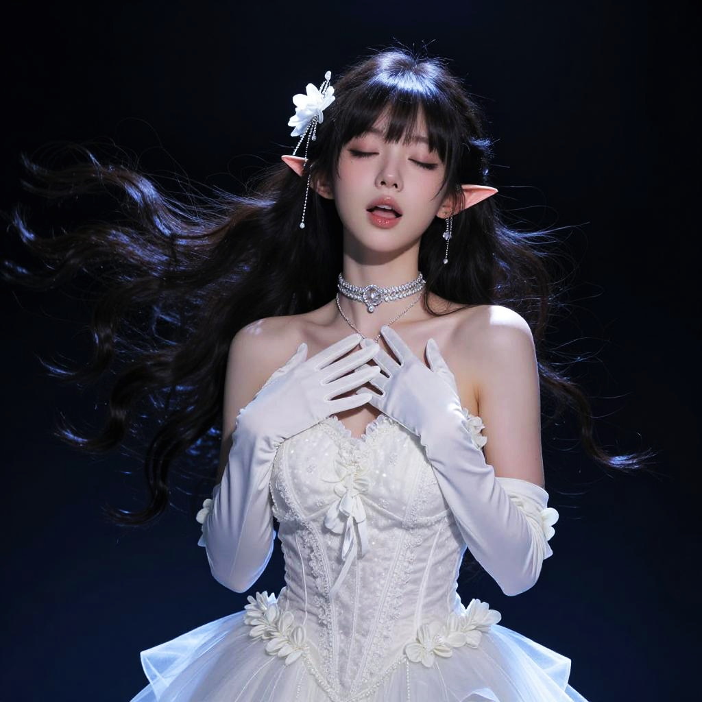 Photograph of an Asian woman with long black hair, pointed elf-like ears, and fair skin, wearing a white, strapless, lace corset dress with floral details and a voluminous tulle skirt. She is adorned with white elbow-length gloves, a choker necklace, and a flower hairpiece. Her eyes are closed, and her lips are slightly parted. She holds her hands delicately over her chest. The background is solid black, highlighting her ethereal, fairy-like appearance. The lighting creates a soft glow around her, emphasizing the delicate textures of her dress and accessories.