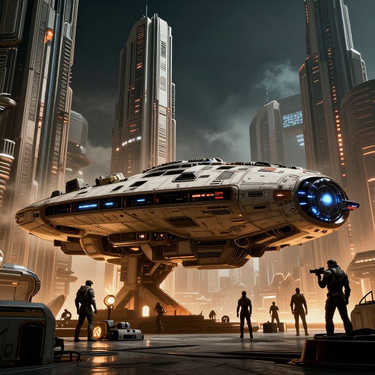 CGI digital artwork depicting a futuristic cityscape at night. The central focus is a large, cylindrical, white and black spaceship with blue lights on the front, hovering above a glowing, fiery plaza. Tall, illuminated skyscrapers with sleek, metallic designs surround the scene. Silhouetted figures, including soldiers and scientists, stand or walk around the plaza, some holding equipment. The sky is dark with clouds, and the ground reflects the city's bright lights. The overall style is reminiscent of sci-fi genres, with a focus on high-tech and futuristic elements.