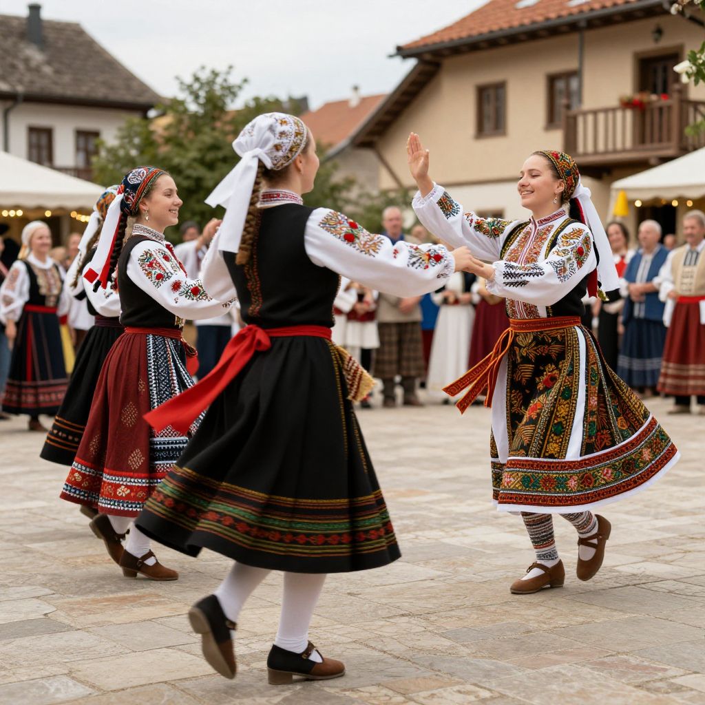 Romanian folk dancers performing a traditional dance in a village square, intricate embroidery on costumes, joyful expressions, energetic motion blur, lively festival atmosphere, detailed cultural patterns, warm daylight, artistic illustration