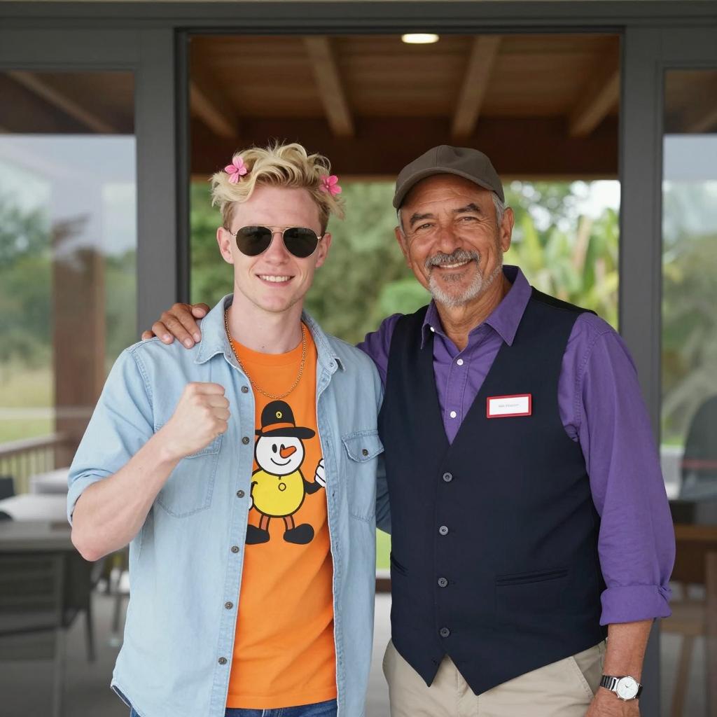 Two men stand at a wooden podium, speaking into microphones. The man on the left has shaggy blonde hair, green face paint, a camouflage vest, and smiles. The man on the right has light brown hair, a blue shirt, and an open mouth. Behind them, yellow flowers and a sunflower are visible. An American flag is on the left, and an Irish flag is on the right. The background includes a white building with wooden trim.