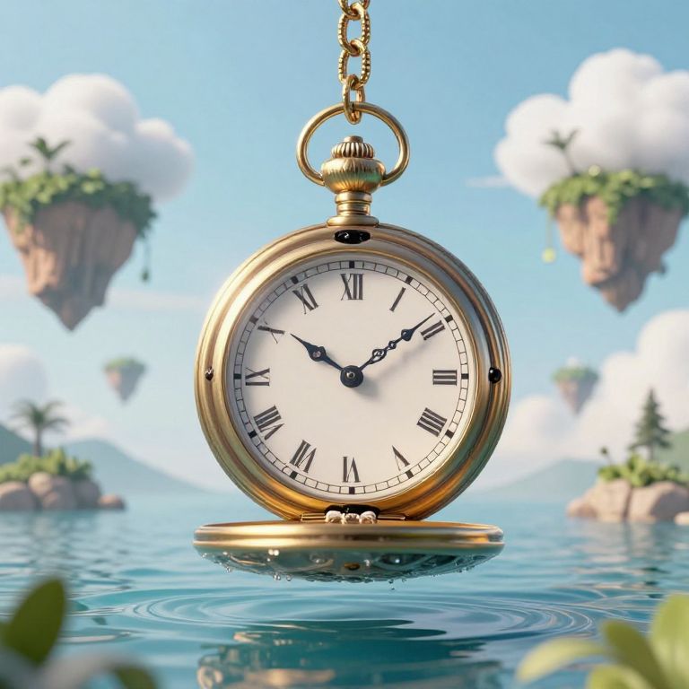 A colossal pocket watch, suspended by a golden chain, floats serenely above a tranquil sea, its hands marking time for a whimsical landscape of floating islands cloaked in clouds and anchored by ethereal greenery.