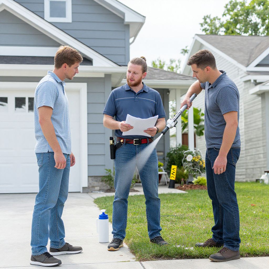 Bust proud home owner discussing project with professional looking man from power washing company in front of his house,