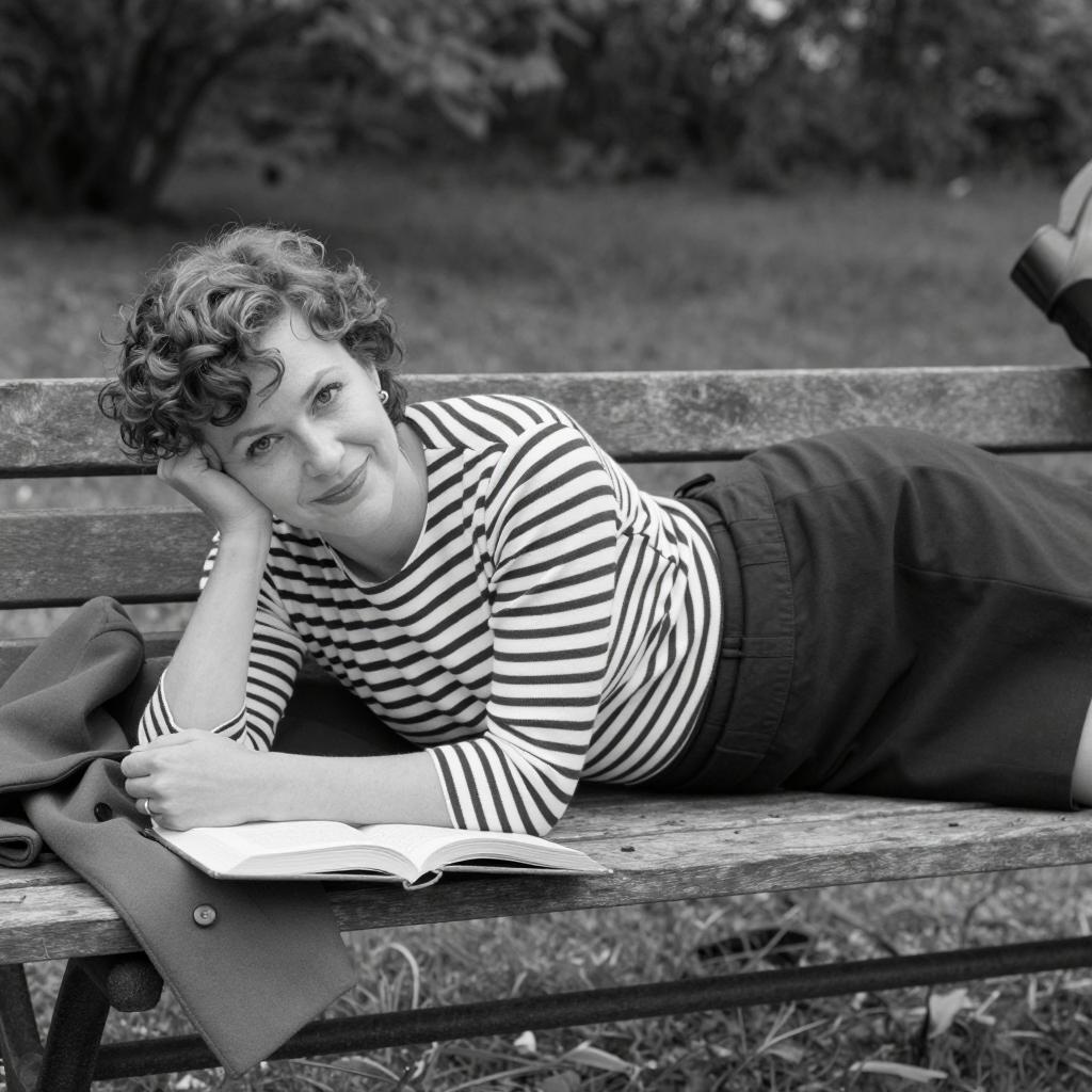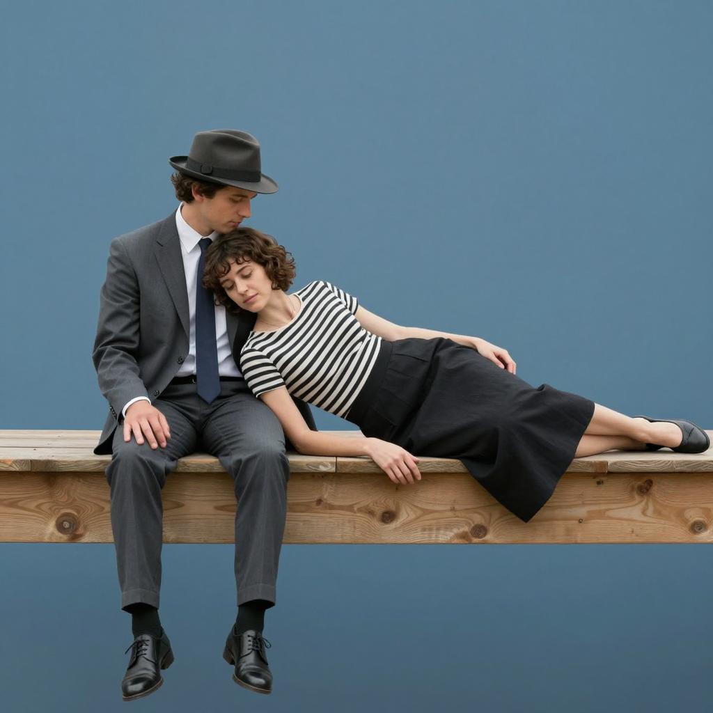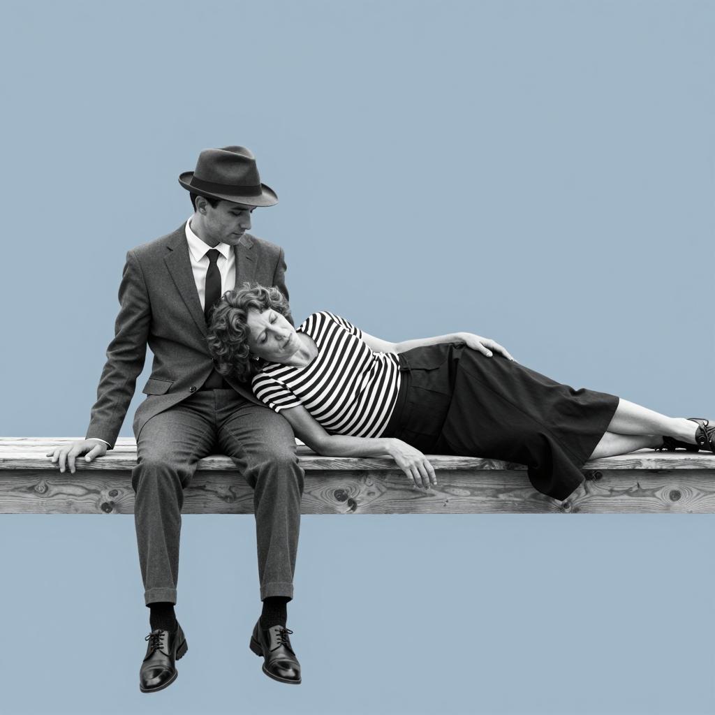 Black and white photograph. Man in a suit and fedora sits on a wooden plank, looking down. Woman in a striped top and long skirt lies diagonally across the plank, resting her head on his shoulder. She has short, curly hair and a relaxed expression. Wooden plank and blue background. Both wear formal attire. Woman's legs extend over the plank, feet in black shoes. Man's left hand rests on his lap, right hand on the plank. Simple, minimalistic composition.