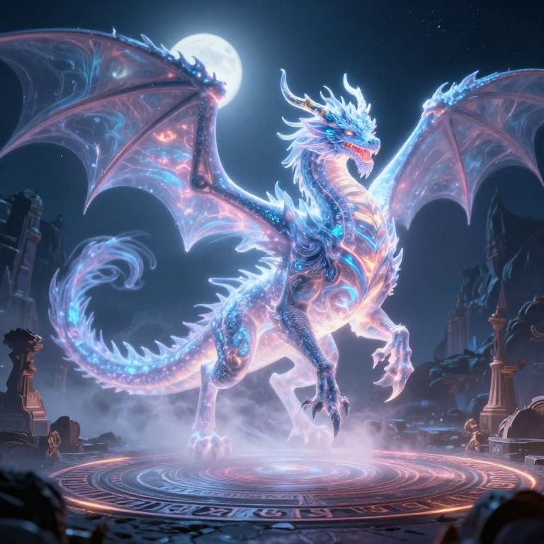 Epic scene of Balldor summoning a colossal spectral dragon in a moonlit valley, ethereal glow illuminating the night, swirling mist and ancient runes on the ground, dynamic and heroic pose, high fantasy style with vibrant colors and intricate details
