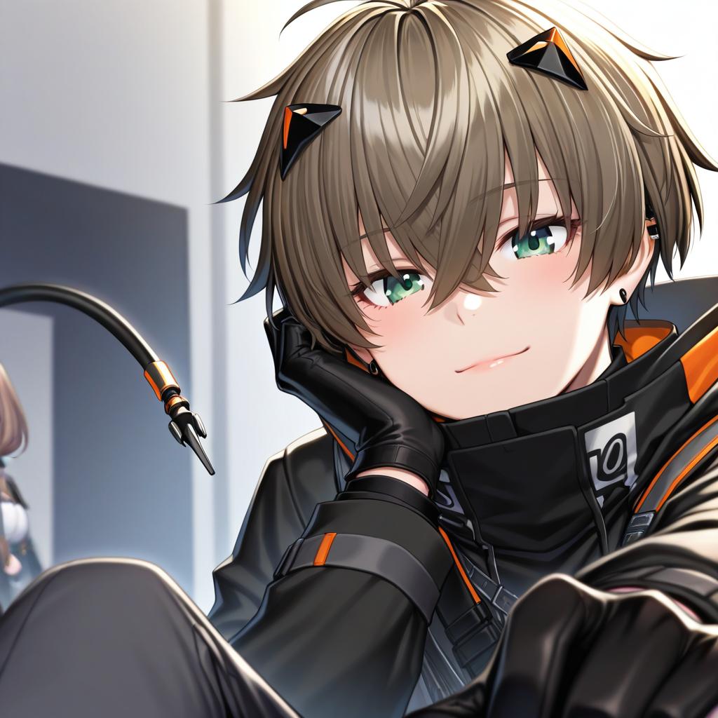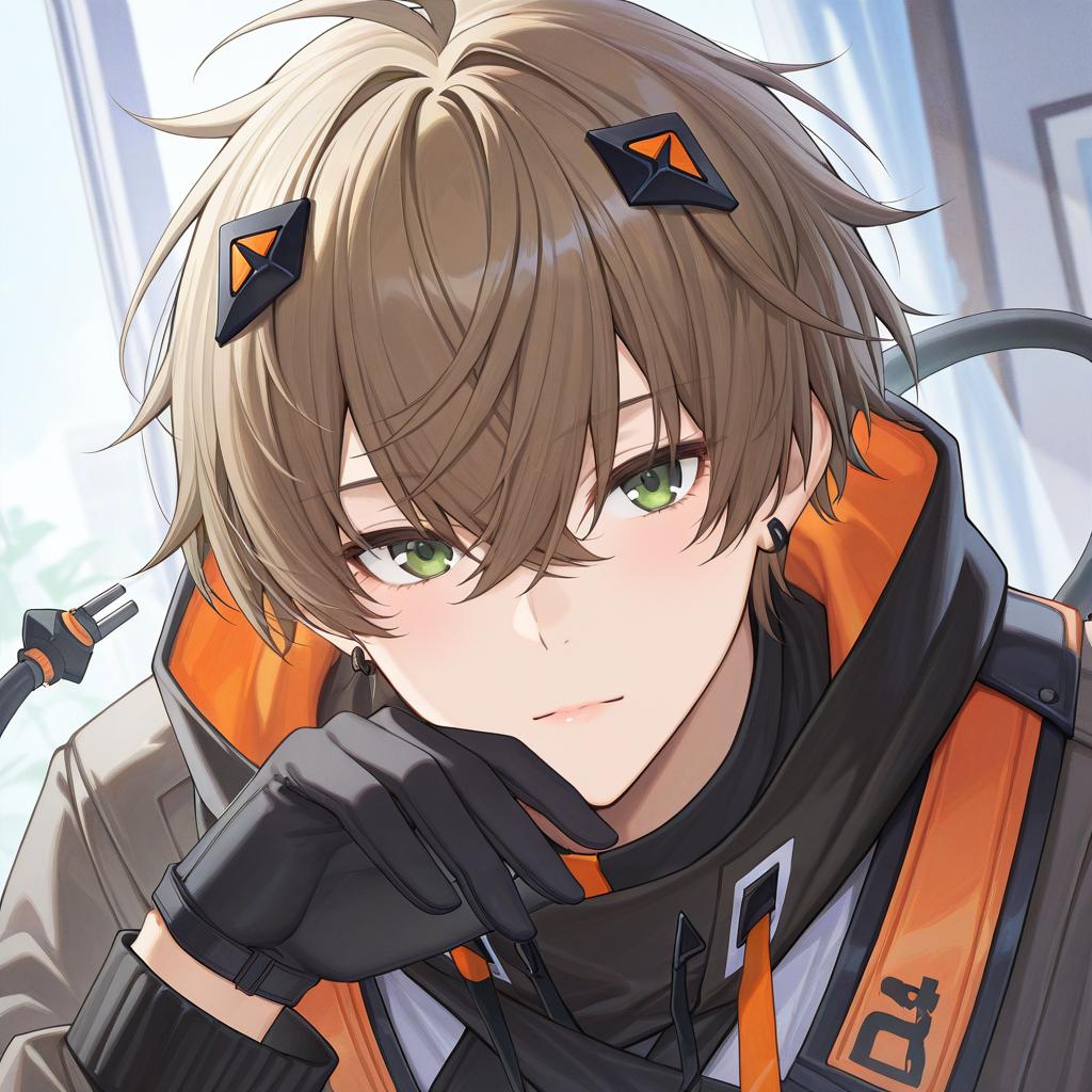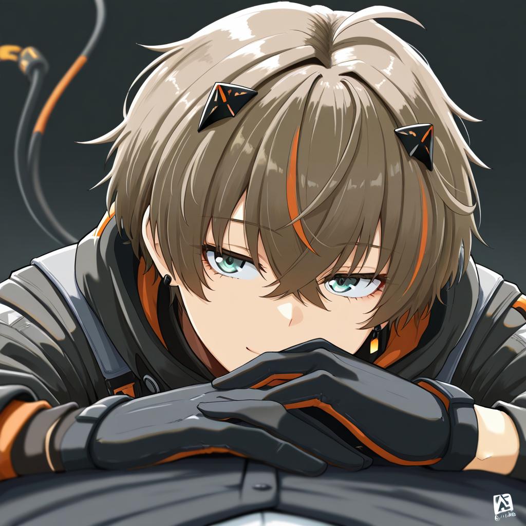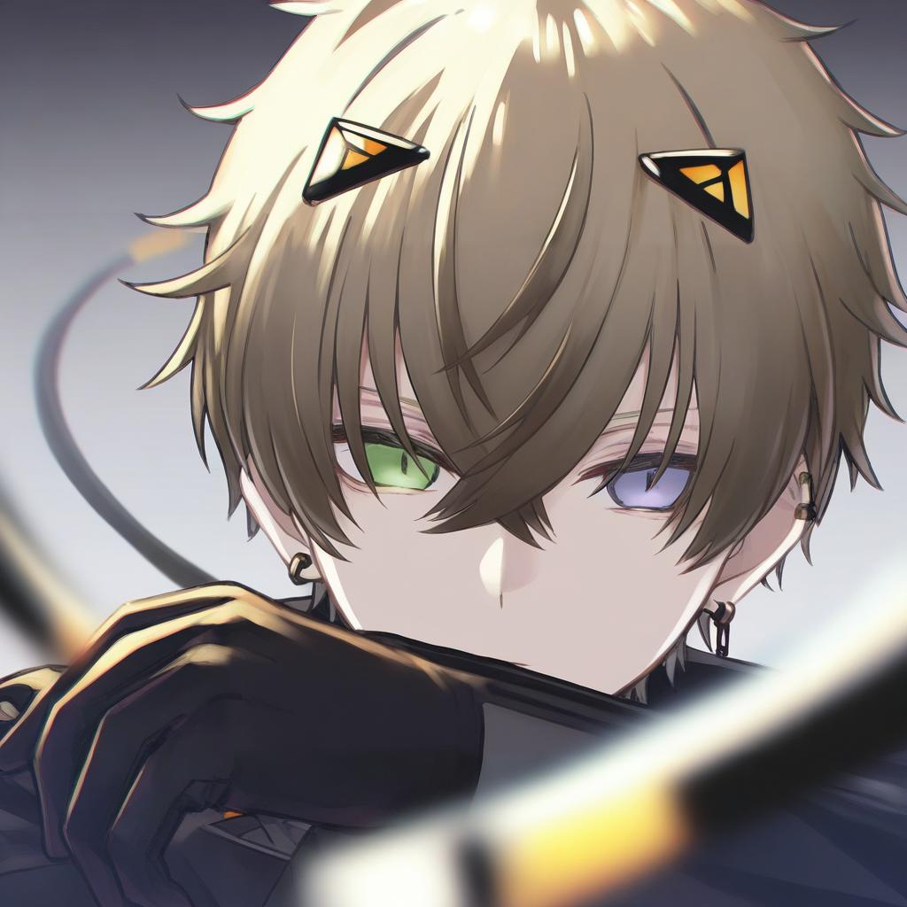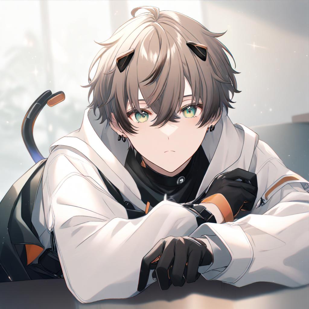 Alban knox, nijisanji, 1boy, heterochromia, cable tail, hair between eyes, grey eyes, green eyes, brown hair, short hair, crossed bangs, black gloves, long sleeves, virtual youtuber, virtual youtuber, earrings, by artist ayakashi (monkeypanch), animagine