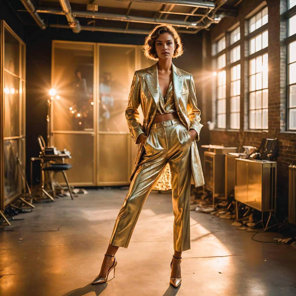 A confident young woman posing with a powerful stance wearing a shimmering gold metallic suit and matching high heels. The photo is taken in a stylish, industrial studio space filled with warm golden hour light streaming through large windows, creating a glamorous and cinematic atmosphere. The setting features modern furnishings and soft lighting emphasizing the high fashion aesthetic.