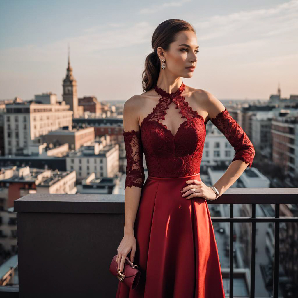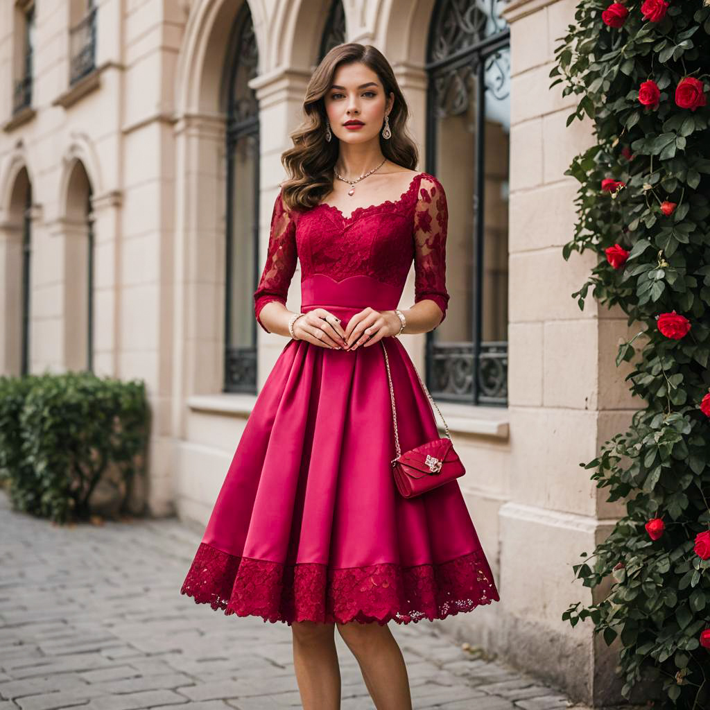 Photo of a Hourglass woman, Soft Waves, Valentine's Day outfit, romantic Crimson dress with lace and heart motifs, elegant satin with a sweetheart neckline, chic and feminine, accessorized with rose gold bracelet, stilettos, holding a side strap bag, elegant garden, lomography style