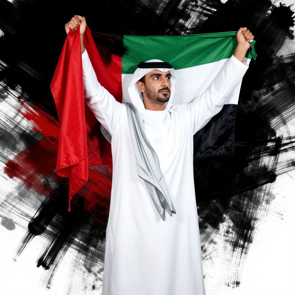 Powerful portrait of a man standing tall, proudly grasping the United Arab Emirates (UAE) flag, its vibrant red, white, green, and black hues bursting forth from a stark monochromatic backdrop, bold brushstrokes and vivid colors radiating energy, emotion, and national pride. Man has masculine face and piercing eyes
