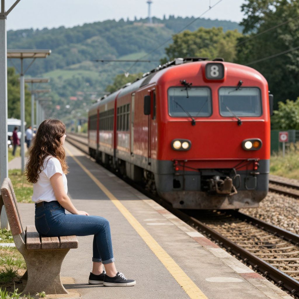 Woman waiting on a sunlit platform as a vibrant red train numbered 8 approaches, with lush green hills and a distant tower visible in the background.