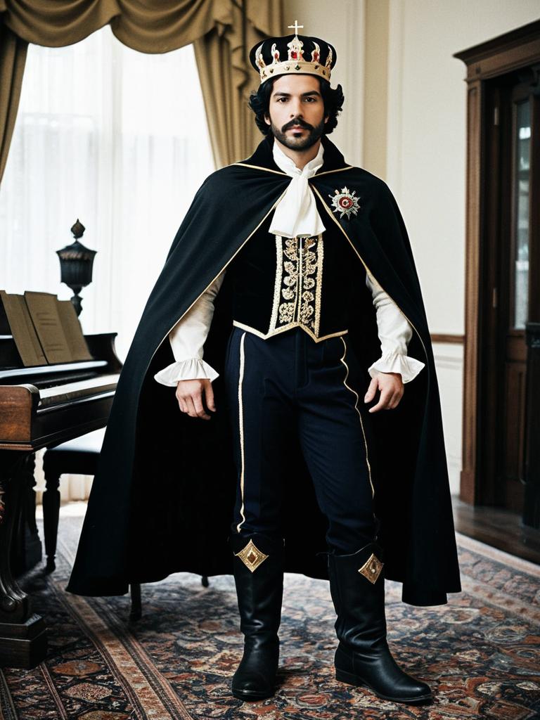 Month prince costume, 1boy, male focus, solo, facial hair, boots, mustache, standing, beard, hat, full body, black hair, ascot, crown, long sleeves, pants, cape, looking at viewer, indoors