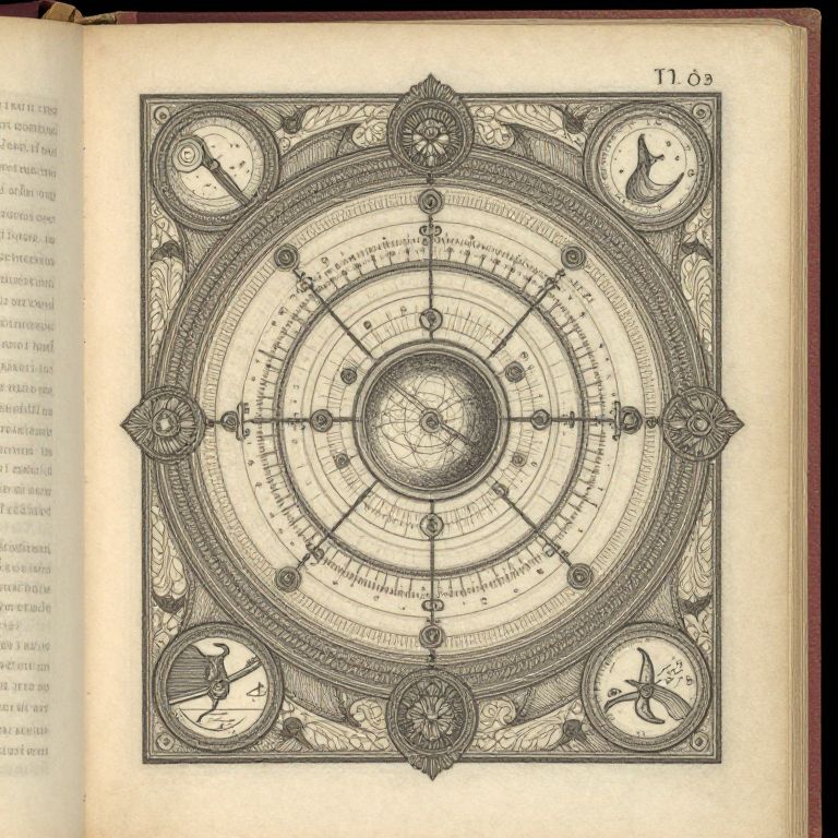 Vintage black-and-white illustration of a detailed, ornate circular astrolabe with intricate patterns, four cardinal direction circles, and text on an open book
