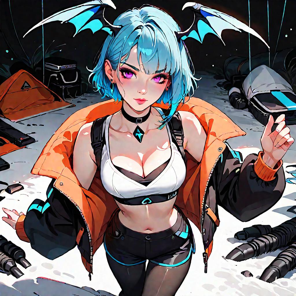 Digital anime-style illustration of a blue-haired, bat-winged girl with pink eyes, wearing an orange jacket, white bra, and black shorts, amidst