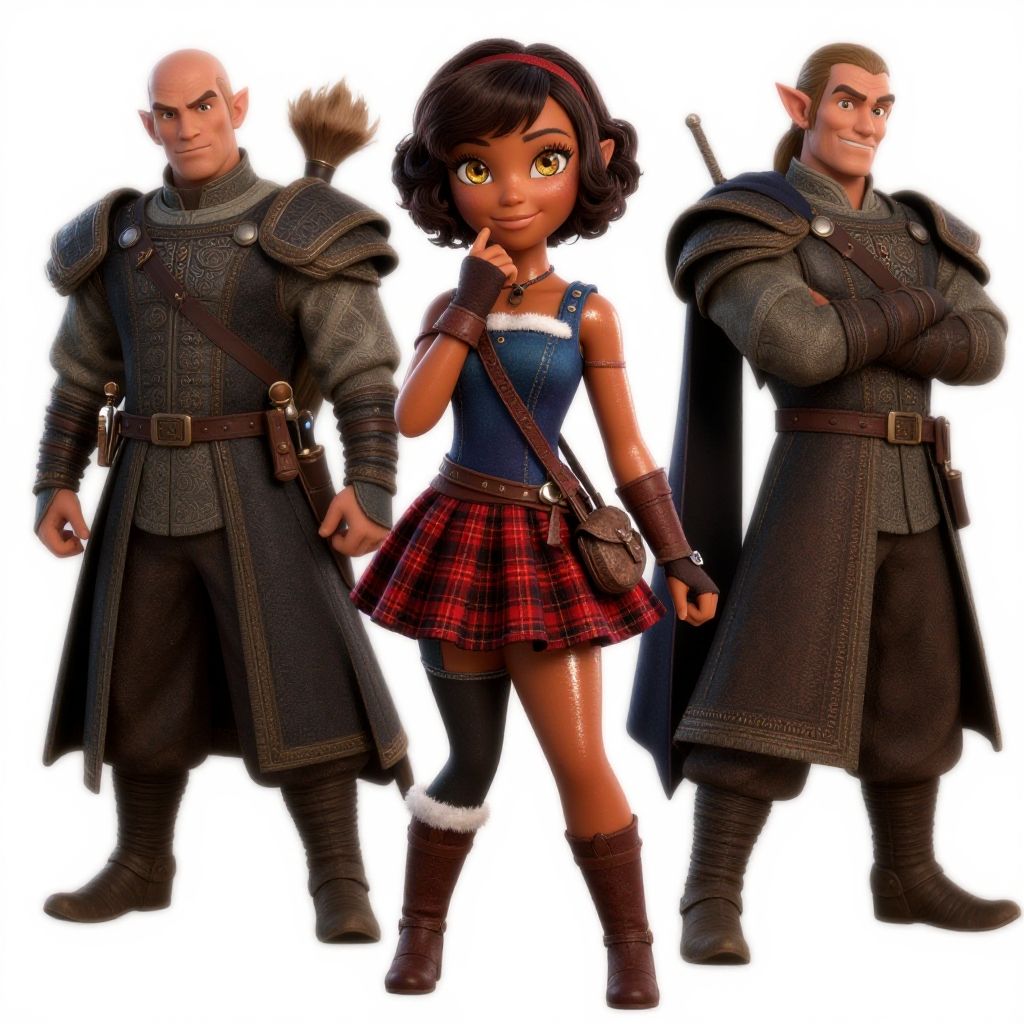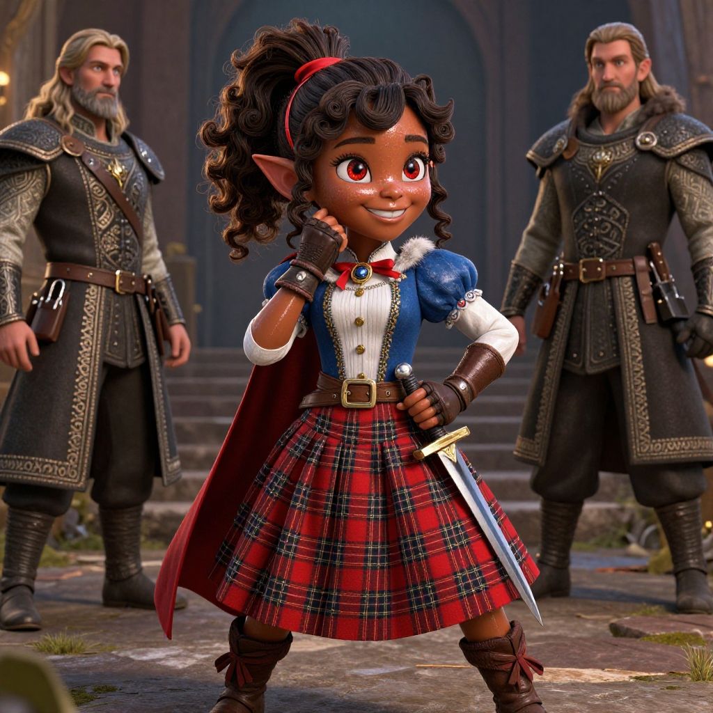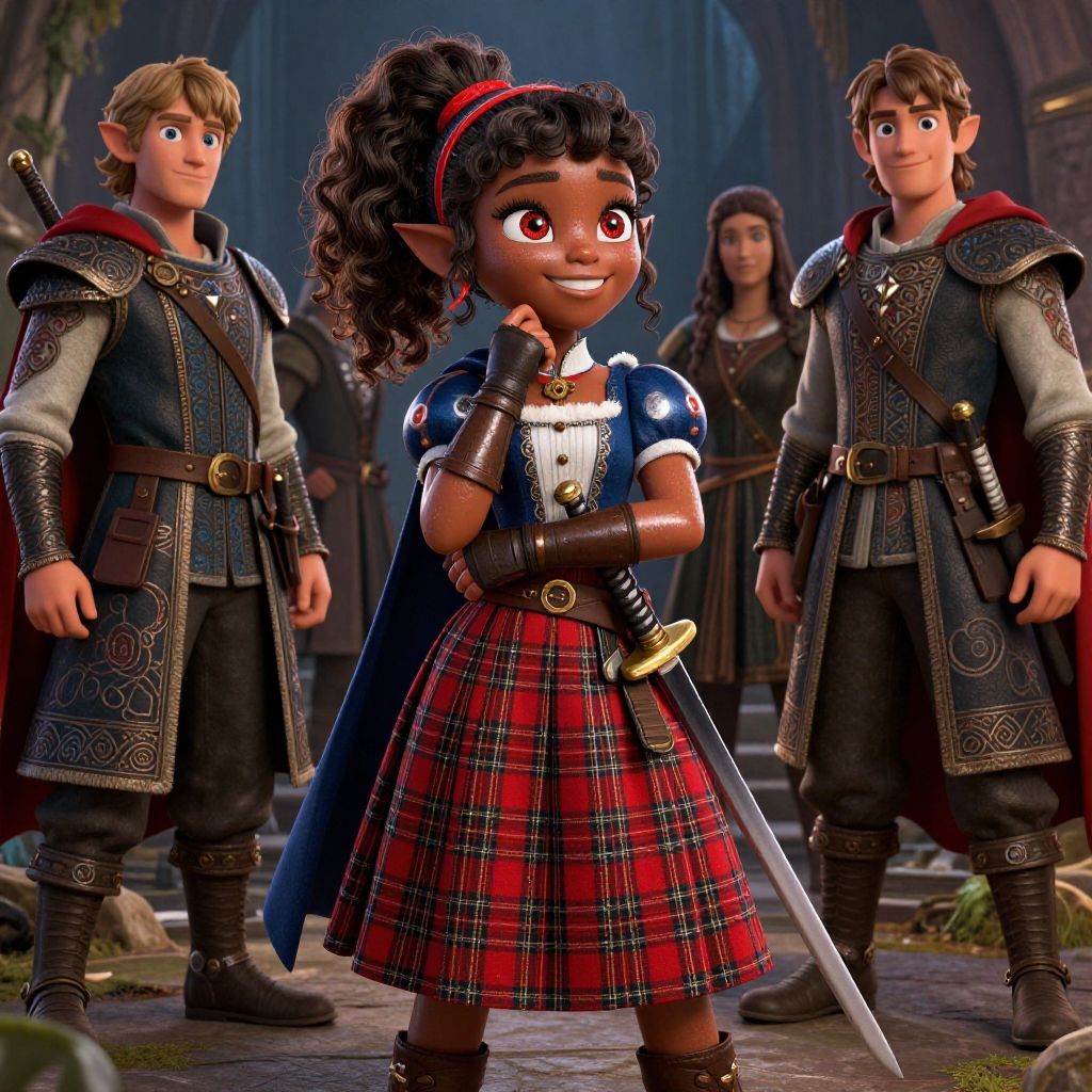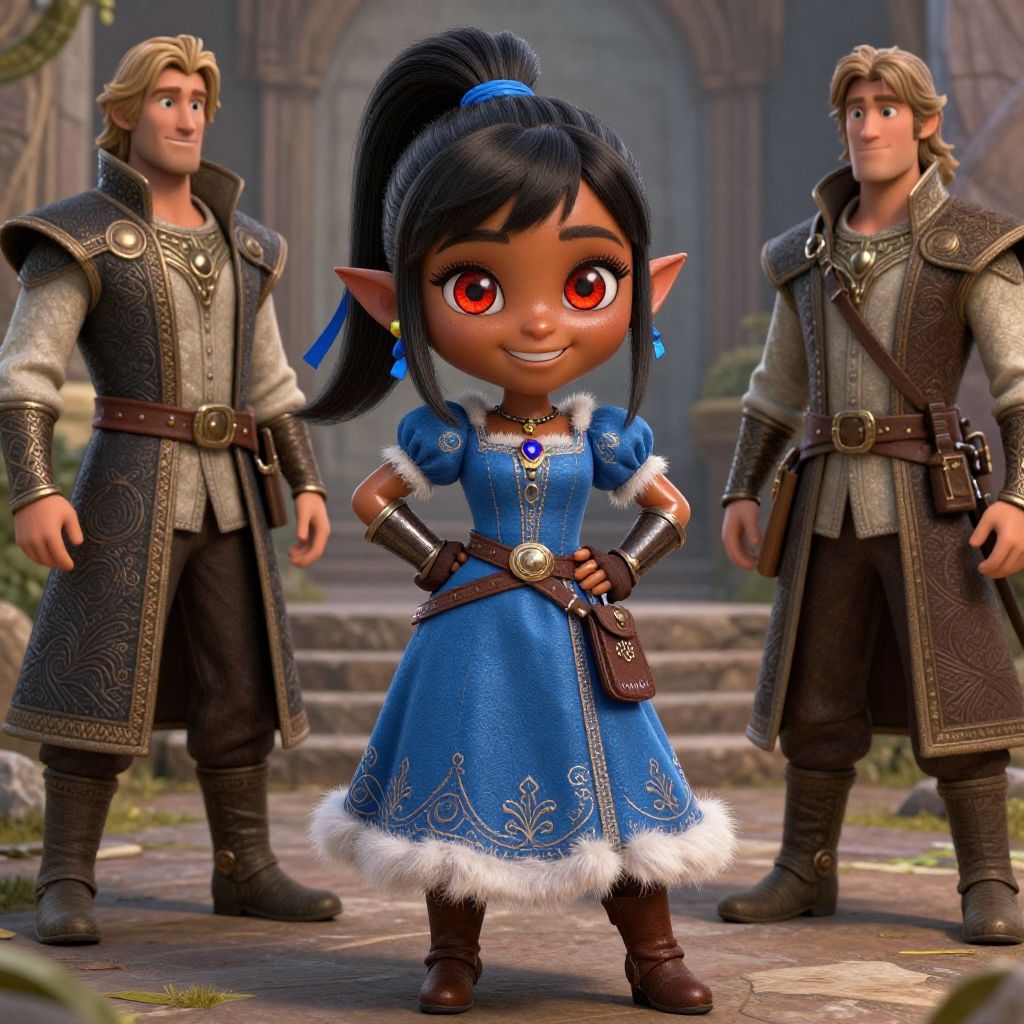Nisei Muramasa, Nisei, 1girl, (Short Hair), Curly hair, (Golden eyes), Thinking Pose, Thinking, cinematic lighting, (Covered Body), Ponytail, hairband, (Small), Long skirt, (Tight Pants, fur trim, armor, fingerless gloves, sash, brown boots, cape), happy smile, brown skin, dark skin, pointy ears, elf ears, ribbon, bangs, (masterpiece:1.1)intricate eyes, beautiful detailed eyes, symmetrical eyes, (dark-skinned female:1.2), cute, adorable, happy, (centered, scale to fit dimensions, Rule of thirds), (ultra detailed, extremely detailed), (photorealistic artwork:1.37), (extremely detailed CG unity 8k wallpaper), (((vibrant colors, vibrant theme))), (intricate), (masterpiece), (best quality), (((medieval man clothes, adventurer man clothing, winter coat))), (((intricate outfit, intricate clothes, embroidered outfit, ornate outfit, embroidered clothes, ornate clothes, Ornate Pants))), (dynamic pose:1.0), (((lustrous skin:1.5, bright skin: 1.5, skin tanned, shiny skin, very shiny skin, shiny body, plastic glitter skin, exaggerated shiny skin, illuminated skin)))