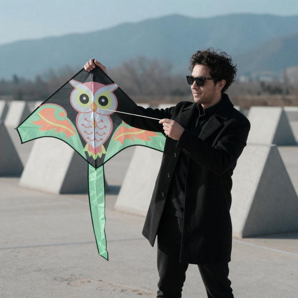 Photograph of a man with dark curly hair and sunglasses, holding a colorful kite with a stylized owl face. He wears a black coat, standing on sandy ground with geometric concrete barriers in the background. Blue-tinted lighting. Mountains and trees in the distance. The man smiles slightly, holding the kite's strings with both hands.
