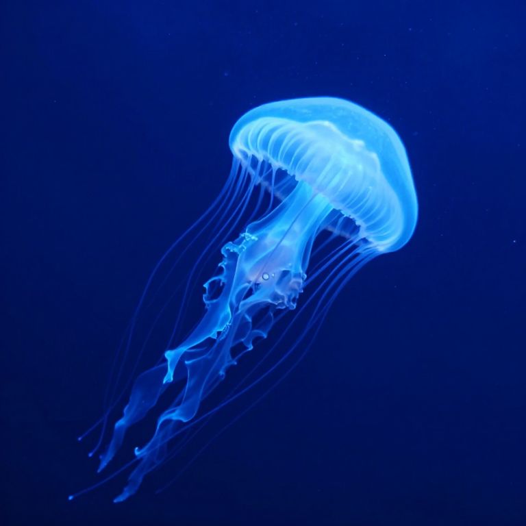Photograph of a glowing blue jellyfish with translucent, flowing tentacles against a dark blue ocean background, illuminating the water.