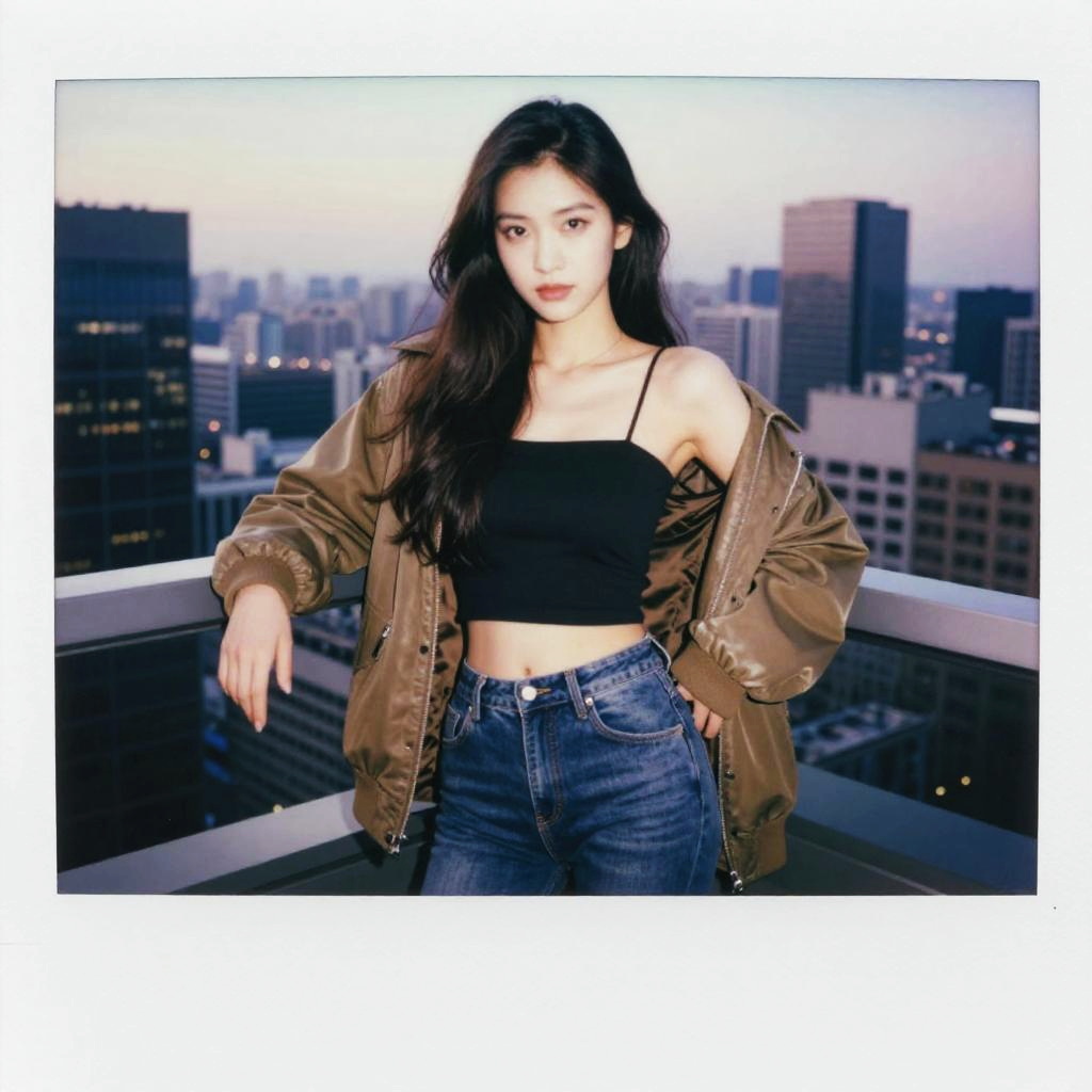Polaroid photo, 1girl, stylish outfit, fitted jeans, oversized jacket, fashionable accessories, (realistic detailed eyes, natural skin texture, confident expression), cityscape backdrop, rooftop or high-rise balcony, dynamic composition, engaging pose, soft yet striking lighting, shallow depth of field, bokeh from city lights, sharp details, highly detailed, hyper-realistic, 50mm lens, naturally blurred background.