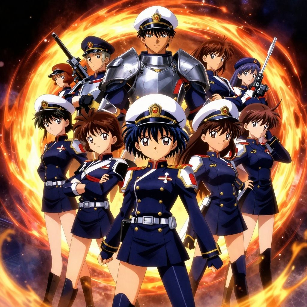 A group of anime-style naval fleet girl characters along with one male character, dressed in stylized navy uniforms with various battleship armor parts and weaponry. The background features a dynamic circular flame effect, giving an energetic and action-packed atmosphere.